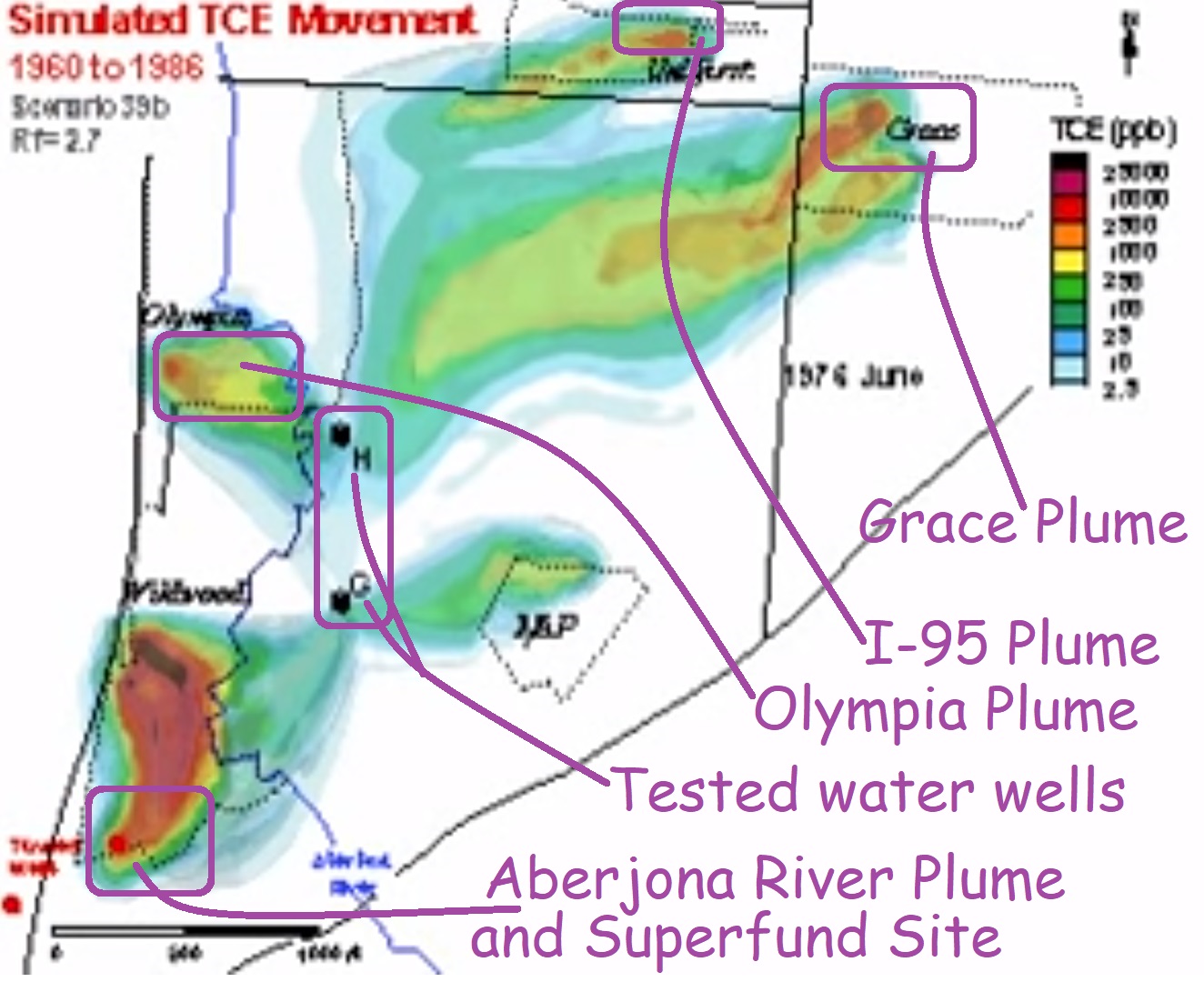 Simulation of Contamination of Groundwater Wells in Woburn MA from 1960 to 1986: (Click for YouTube video) "From Wooster College Geology Program; Childhood Leukemia cases linked to groundwater wells containing TCE in the 1970s."
