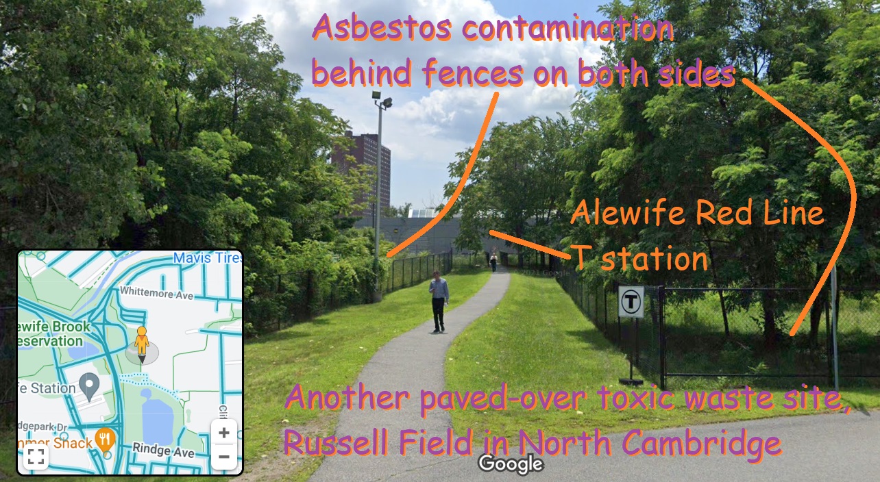 The same company that toxified Woburn, W. R. Grace, also happened to be my neighbor when I lived in North Cambridge around that same time. The Grace property was between my home and the Red Line Alewife station -- shown in the photo behind all those fences, because it was a toxic waste site too (asbestos contamination in this case). People who walked to my home from Alewife between the two fences would comment, "It feels like you're walking through a toxic waste site," because, once again, they literally were.