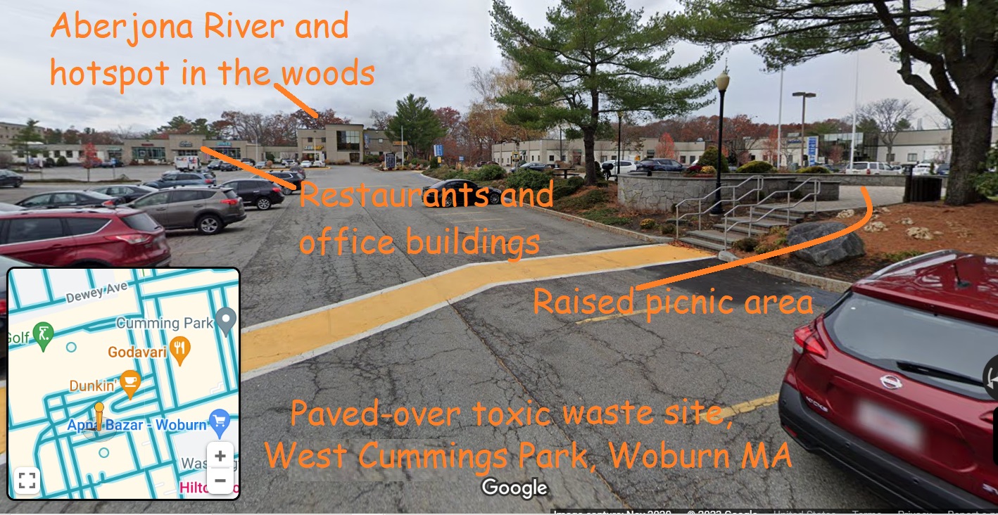 I happened to work for several years at West Cummings Park in Woburn, which is located on Washington Street, right on the red spot labeled "Grace Plume" on the map above. I worked there in the early 2000s, after the cleanup occurred, but the people of Woburn still all said "Don't drink Woburn water!" The hotspot was on the Aberjona River in the woods behind the office park. Our multi-building office park was "remediated" by disallowing ground contact -- the entire office park was paved to "seal in" the contaminants. Since office parks should have picnic areas so employees can go outside for lunch, Cumming Park built those as "raised structures" with 3 feet of dirt added ABOVE the pavement, with picnic tables on top of the dirt.