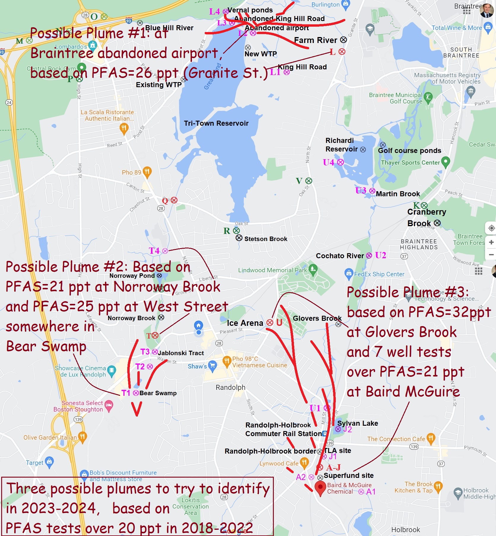 The Woburn story is relevant to Randolph and Holbrook because we can use the same methods that Woburn used, to find our underground PFAS plumes. They did it in the 1980s -- the technology is not rocket science and our DPW is entirely capable of it. It just requires traipsing around in the woods taking water samples and soil samples, and sending them to a PFAS testing lab. I have done that traipsing myelf in Braintree, to try to find a PFAS hotspot from their abandoned airport -- I send in my water samples to a lab for $75 -- I haven't found a PFAS hotspot yet, but I'll keep trying!