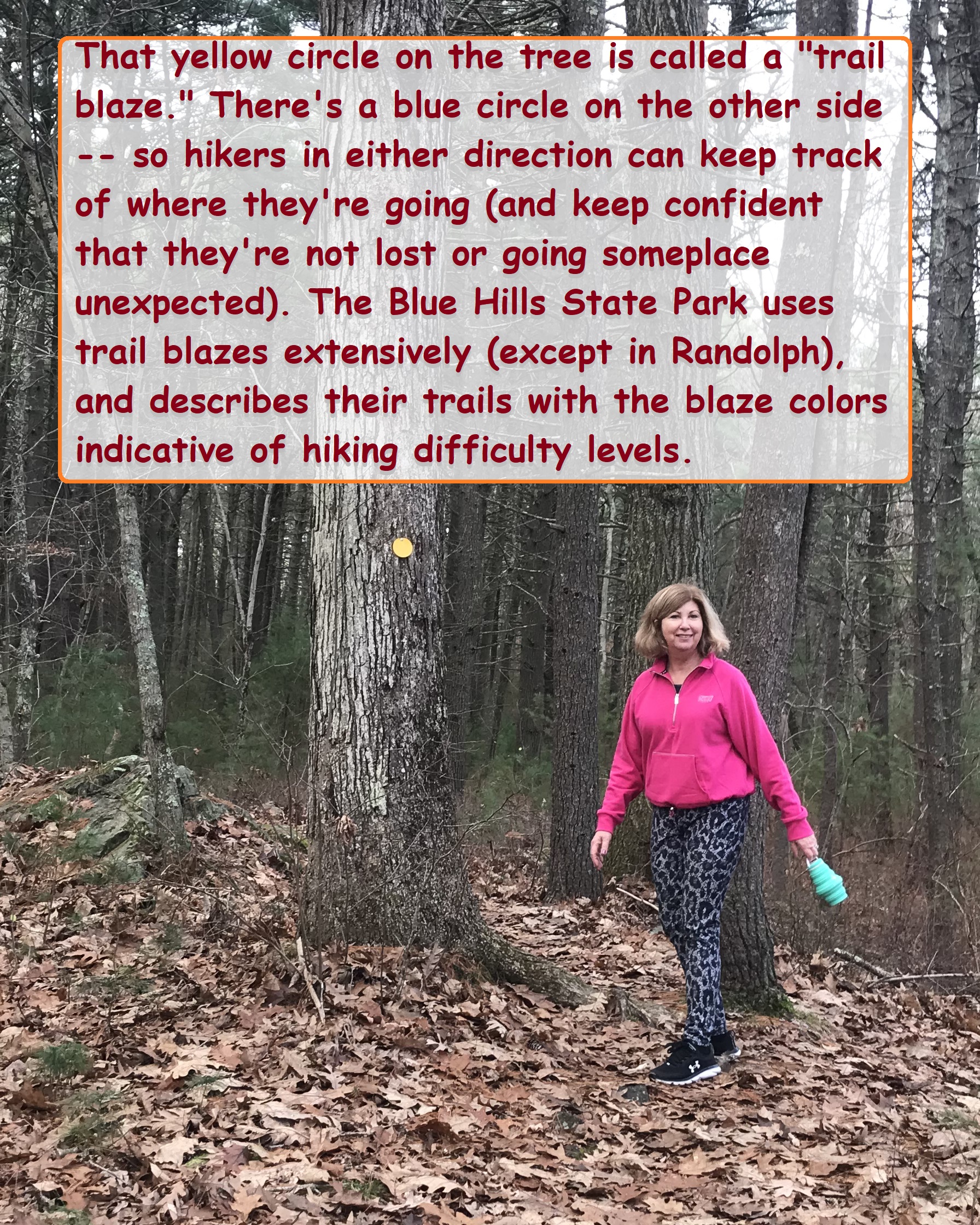 That yellow circle on the tree is called a "trail blaze." There's a blue circle on the other side -- so hikers in either direction can keep track of where they're going (and keep confident that they're not lost or going someplace unexpected). The Blue Hills State Park uses trail blazes extensively (except in Randolph), and describes their trails with the blaze colors indicative of hiking difficulty levels.