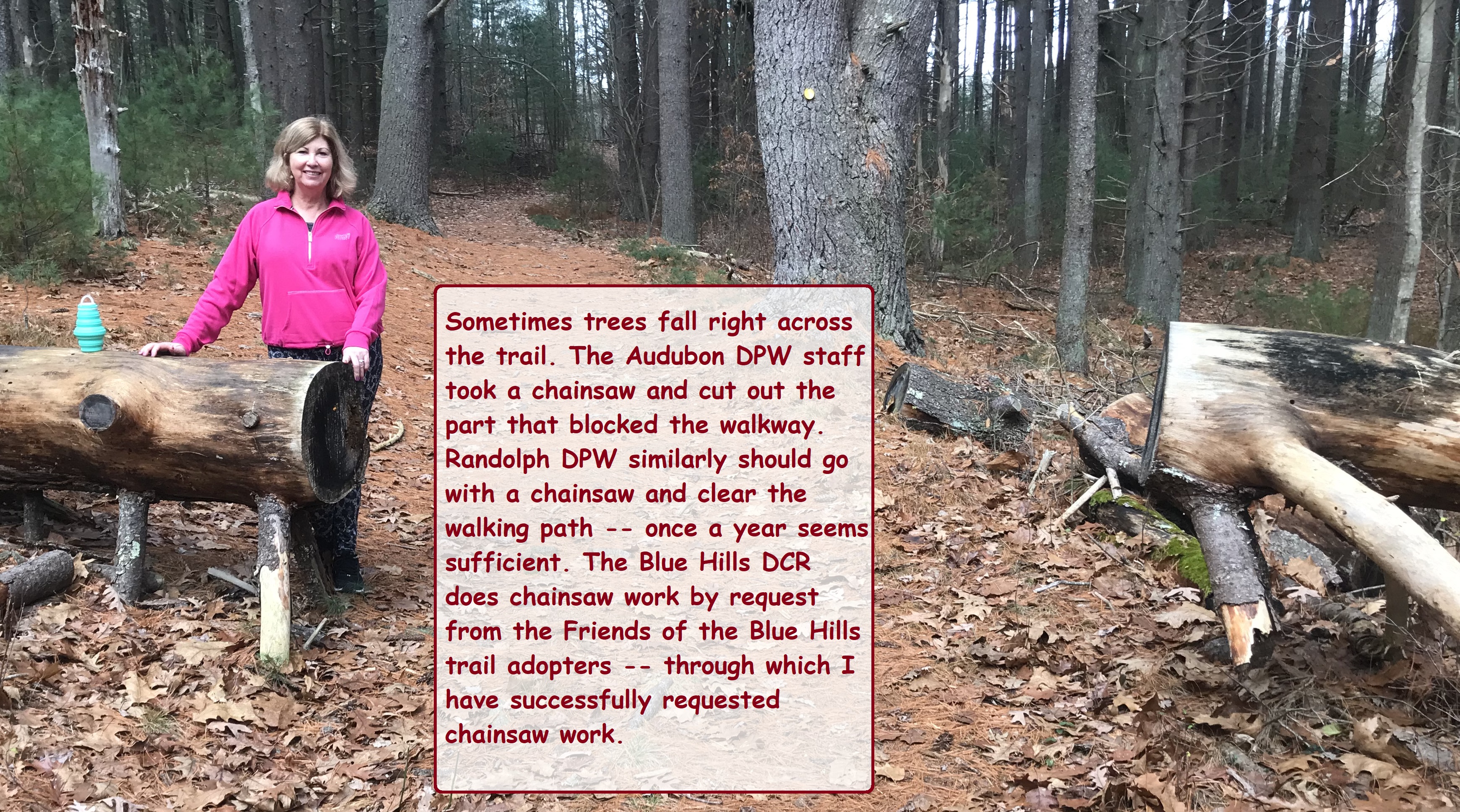 Sometimes trees fall right across the trail. The Audubon DPW staff took a chainsaw and cut out the part that blocked the walkway. Randolph DPW similarly should go with a chainsaw and clear the walking path -- once a year seems sufficient. The Blue Hills DCR does chainsaw work by request from the Friends of the Blue Hills trail adopters -- through which I have successfully requested chainsaw work.