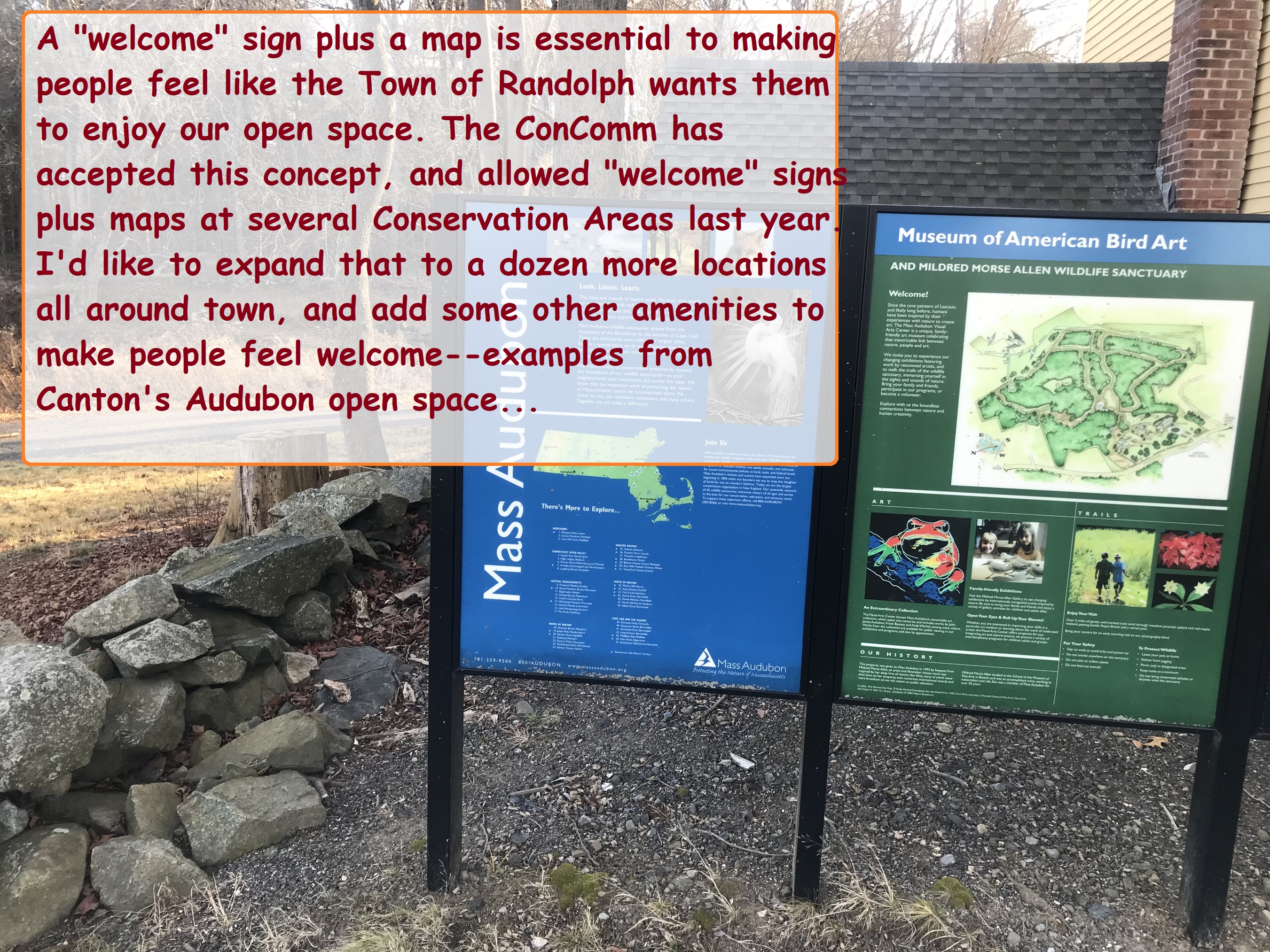 A "welcome" sign plus a map is essential to making people feel like the Town of Randolph wants them to enjoy our open space. The ConComm has accepted this concept, and allowed "welcome" signs plus maps at several Conservation Areas last year. I'd like to expand that to a dozen more locations all around town, and add some other amenities to make people feel welcome--examples from Canton's Audubon open space...
