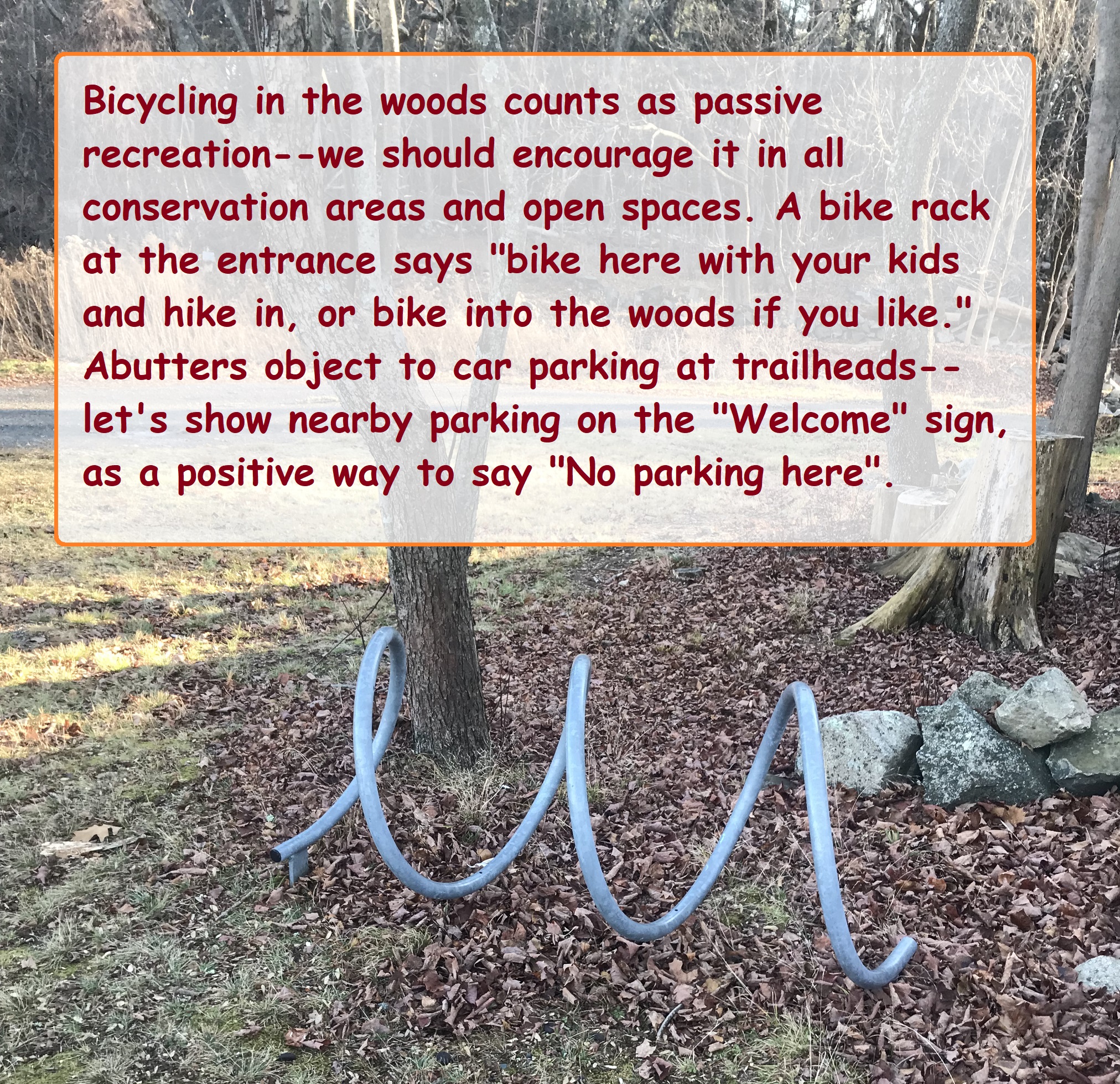 Bicycling in the woods counts as passive recreation--we should encourage it in all conservation areas and open spaces. A bike rack at the entrance says "bike here with your kids and hike in, or bike into the woods if you like." Abutters object to car parking at trailheads--let's show nearby parking on the "Welcome" sign, as a positive way to say "No parking here".