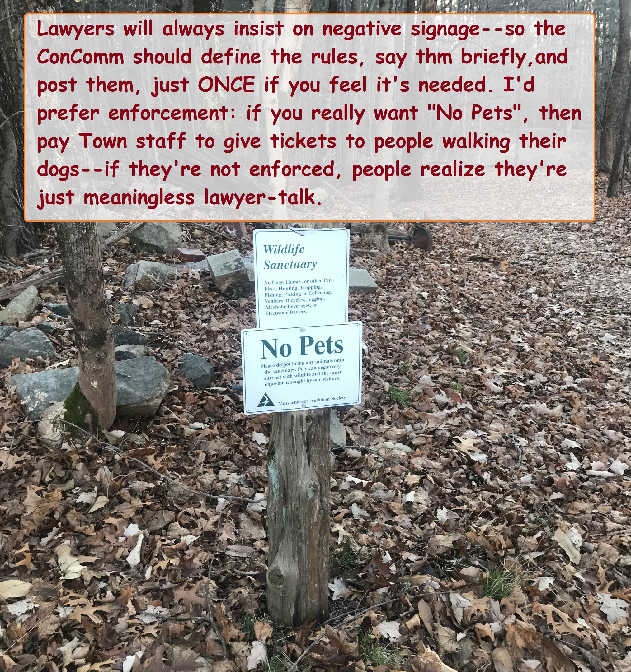 Lawyers will always insist on negative signage--so the ConComm should define the rules, say them briefly,and post them, just ONCE if you feel it's needed. I'd prefer enforcement: if you really want "No Pets", then pay Town staff to give tickets to people walking their dogs--if they're not enforced, people realize they're just meaningless lawyer-talk.