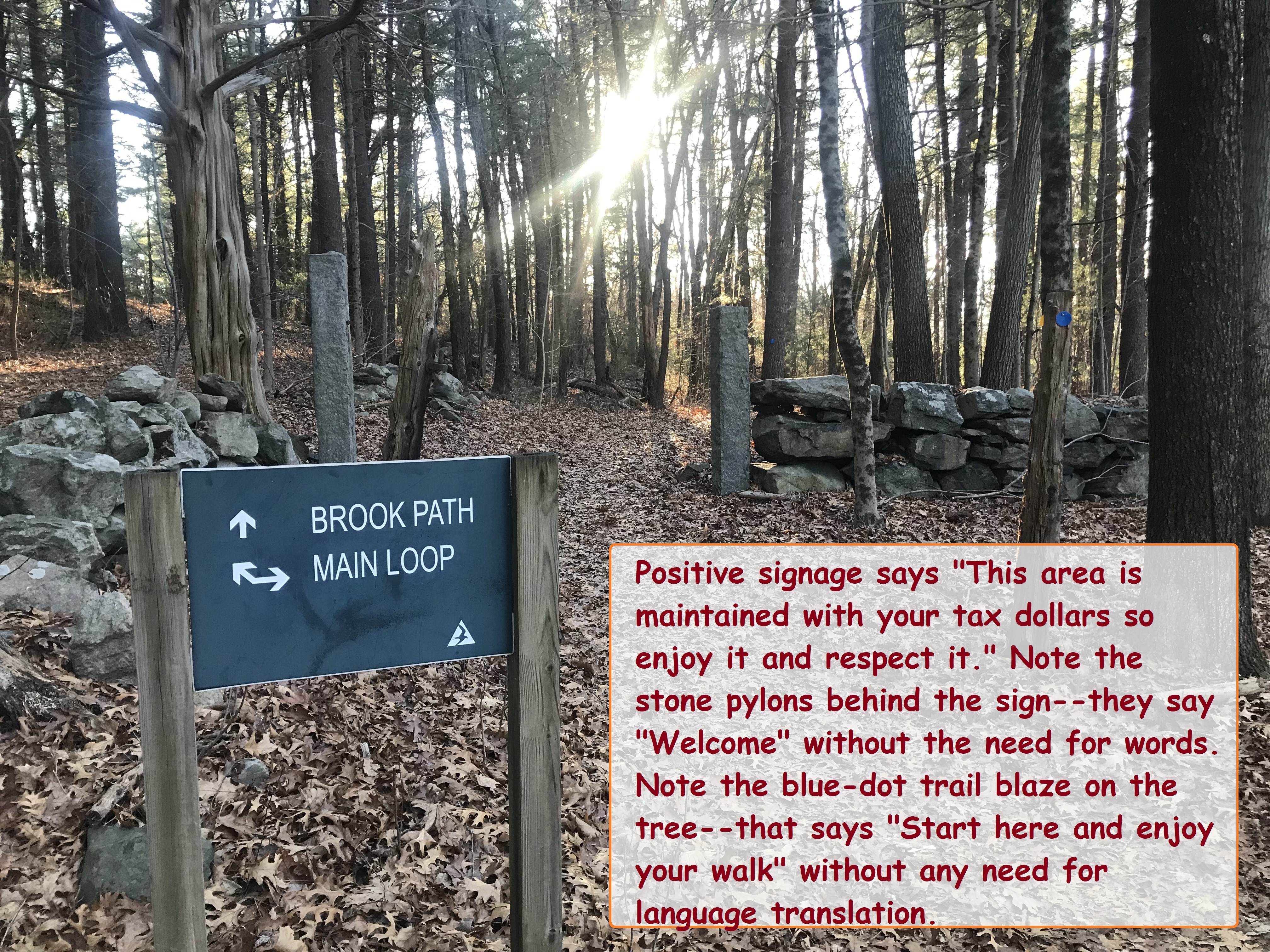 Positive signage says "This area is maintained with your tax dollars so enjoy it and respect it." Note the stone pylons behind the sign--they say "Welcome" without the need for words. Note the blue-dot trail blaze on the tree--that says "Start here and enjoy your walk" without any need for language translation.