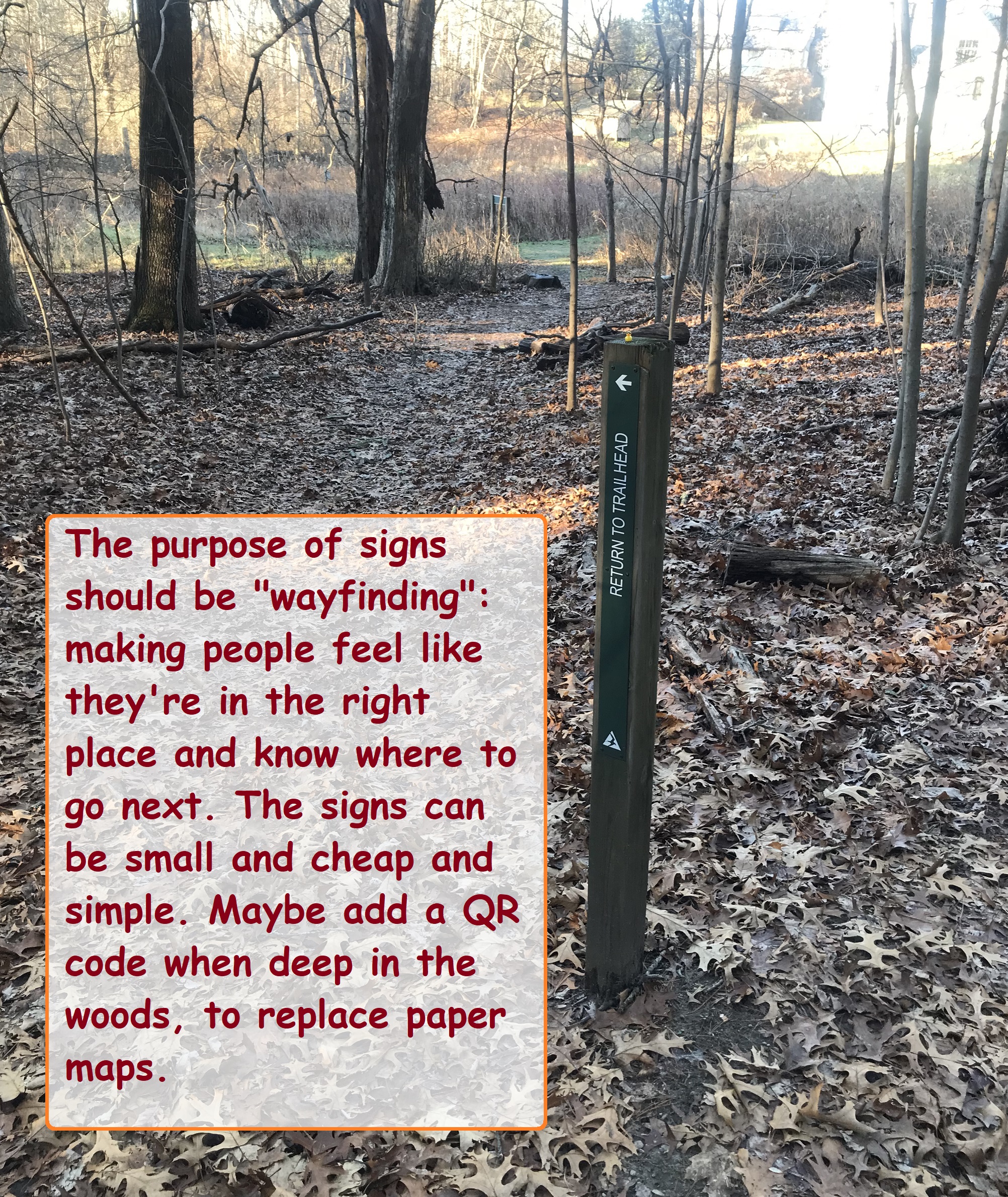 The purpose of signs should be "wayfinding": making people feel like they're in the right place and know where to go next. The signs can be small and cheap and simple. Maybe add a QR code when deep in the woods, to replace paper maps.