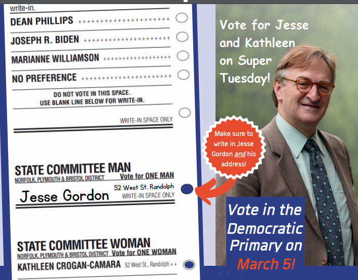 Kathleen says, "Most people vote in the Democratic presidential primary, but few people know that the same ballot fills the Democratic Party seats. Please remember to vote for me, too, way down the ballot on March 5, and please remember me in September for State Senate!" Jesse says, "Kathleen's name will appear on your ballot for Committeewoman, but I'm asking you to write in my name for Committeman. There'll be a blank space for you to write 'Jesse Gordon, 52 West Street, Randolph MA' and it's easy to remember my address because it'll be printed on the ballot for my wife Kathleen."