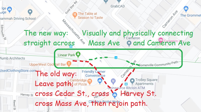 How do we get from Powers Farm to the Dog Park? From Belcher Park to the Community Center? From North Randolph to Ponkapoag Pond? All of those are walkable, and all could be part of a "connect-the-dots" project across Randolph. This video shows one such "connectivity" project in which Jesse Gordon participated in Cambridge and Somerville -- visually "connecting" a pedestrian walkway from one side of Mass Ave (Route 2A) to the other side.