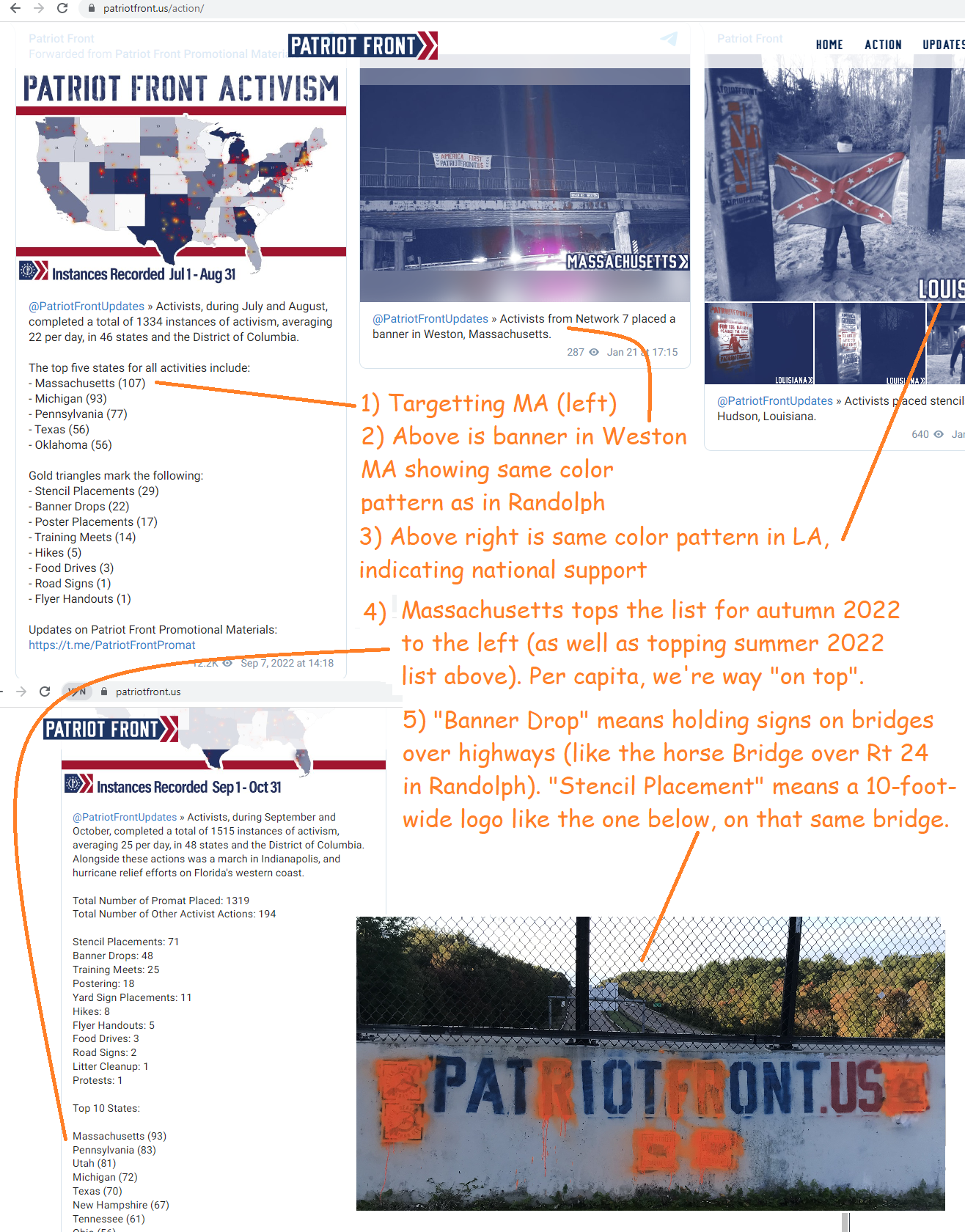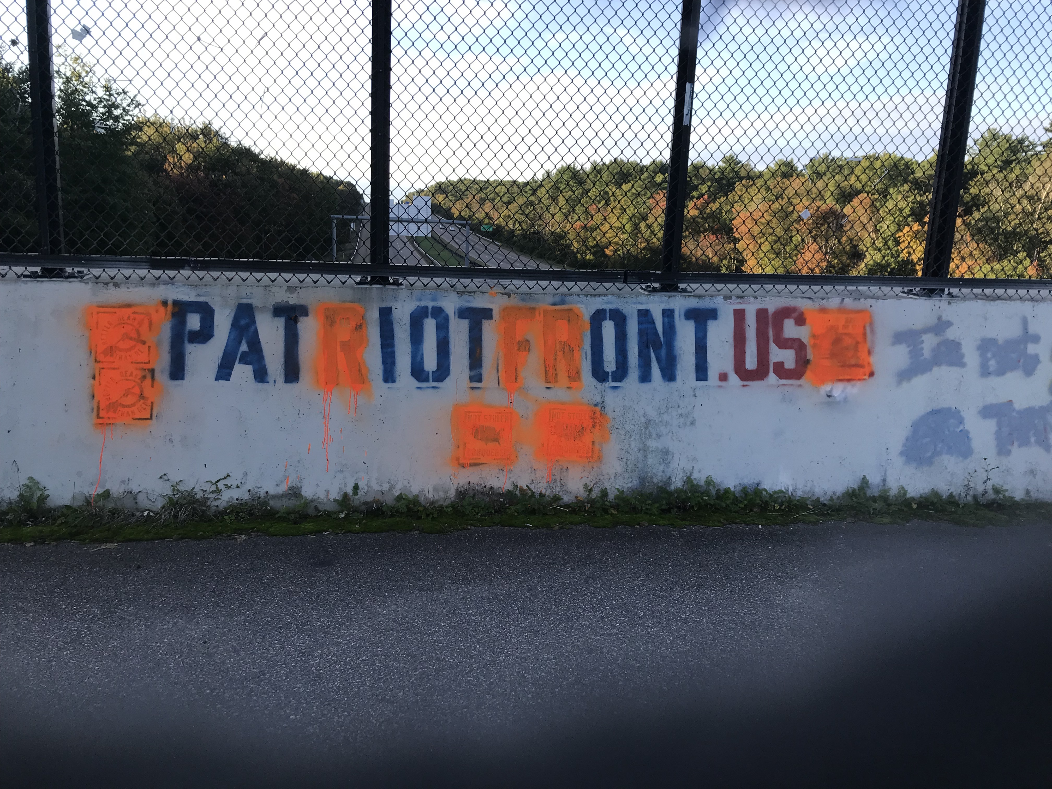 To see what could be done to prevent similar incidents in the future, I contacted the ADL (Anti-Defamation League) and the SPLC (Southern Poverty Law Center). Both those organizations denounce the PatriotFront.us on their own websites, and detail that this hate group has targeted Massachusetts, and focuses on holding banners on highway bridges, and stenciling around town afterwards. The PatriotFront.us website itself openly documents and encourages these activities. I would like to see the leadership of the PatriotFront.us charged with hate speech for facilitating that instance of hate speech in our district.