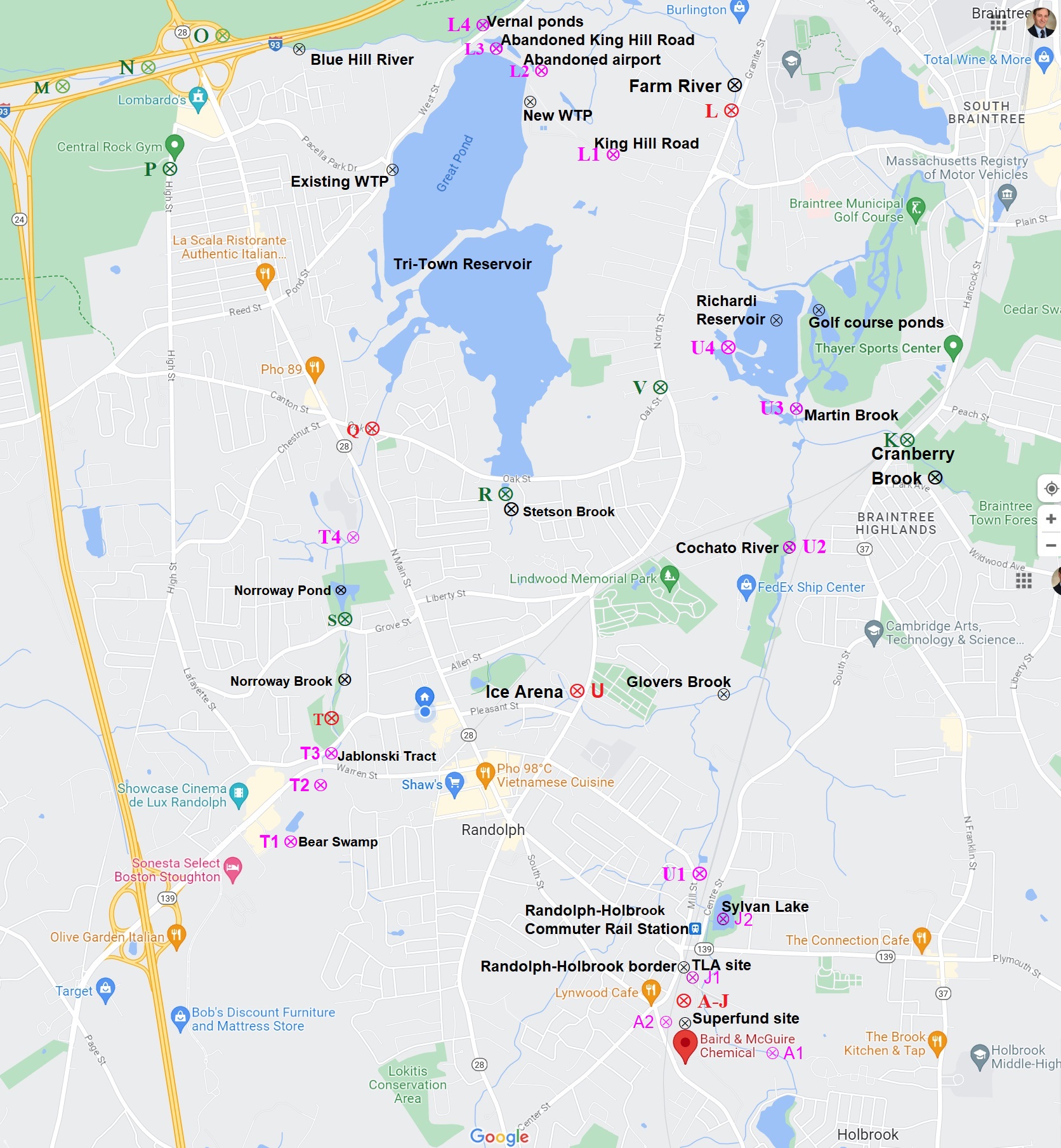 A-J) Ten PFAS testing sites around the Baird-McGuire Superfund site were tested from 2018 to 2019, and seven sites scored PFAS over 20 ppt. That means there's likely a hotspot somewhere in that area -- I propose several testing sites (A1/A2/A3) downstream from the Superfund site, and others (J1/J2) at the TLA site to try to find a hotspot. All of these proposed testing sites are in Holbrook, not Randolph.