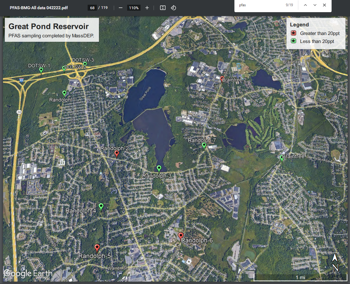 - WHEREAS MassDEP found PFAS levels in excess of 20 ppt at 3 of those locations, as well as 7 locations in Holbrook and 1 location in Braintree, all upstream from Tri-Town Reservoir; and