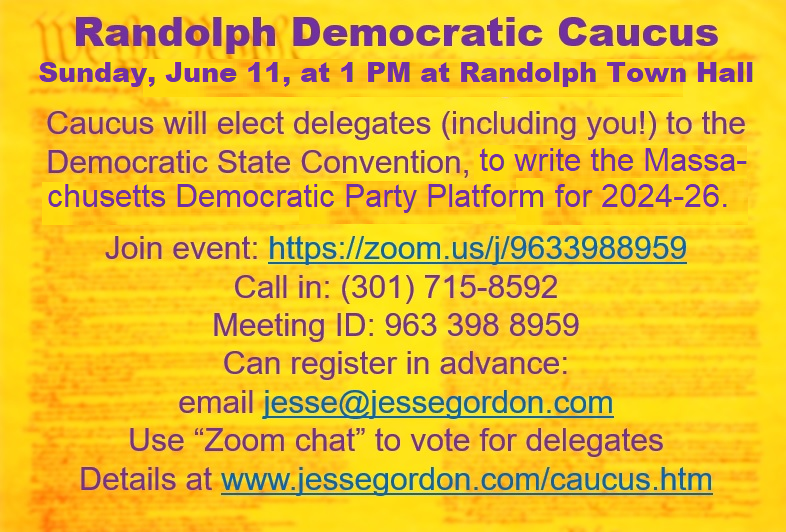 Randolph Democrats to hold Caucus on Sunday June 11 at 1 PMContact: Jesse Gordon, Randolph Dems chair 617-320-6989 Click here for charming Mass Dems Caucus video Randolph is about to have a well-hidden exercise in democracy -- in which you can participate and make it less well-hidden. During February, the Democratic Party and the Republican Party will hold caucuses across the state, including one each in Randolph, at which delegates to the statewide conventions will be selected. The Democratic delegates elected on June 11 will attend the Massachusetts Democratic State Convention, to be held in Lowell (hybrid) on Sept. 23. At that convention, the Massachusetts Democratic Party Platform (the issue stances) and Massachusetts Democratic Party Charter (the party rules) will be amended and voted upon. Those issue stances and rules will apply for the 2024 elections and beyond. The Randolph Democratic Town Committee will hold a hybrid caucus on Sunday June 11 at 1 PM (Zoom link below), to decide who Randolph will send to the Democratic State Convention. The Randolph Republican Town Committee will hold their caucus at a time and place to be announced shortly -- contact for the GOP chair is below. The caucus and convention process traditionally favors "party insiders" who know about the caucus and who attend with their friends to vote for them as delegates to the convention. But knowing the rules -- outlined here -- allows anyone to attend, and could make the process more "grass roots." To be eligible to attend the Democratic caucus, you must be a registered Democrat on the day of the caucus. Similarly, for the Republican caucus to be held later, you must be a registered Republican. You can change your party registration, including from unregistered or independent status, up until the day before the caucus, online in advance or in-person at the Town Clerk's office at Town Hall. This year the caucuses will be "hybrid" (in-person plus virtual) – Randolph’s caucus will be held at Randolph Town Hall (41 South Main Street) or by Zoom link https://us02web.zoom.us/j/9633988959 or Zoom call-in (301) 715 8592. The doors at the caucus are traditionally locked at the appointed hour, so you must arrive on time – for the hybrid caucus, just Zoom in on time, and announce yourself to the Zoom host so your party registration can be checked. "Last year we held virtual caucuses for the Nominating Convention to decide the Governor’s primary, where delegate seats were open for the asking," says Randolph Democratic Town Committee Chair Jesse Gordon. "This year's caucuses are for an Issues Convention so we don’t expect high attendance or competitive delegate seats – just show up and you can attend the State Convention and vote there. It's fun! -- and call me if you have trouble registering as a Dem, or joining on caucus day." The Randolph Dems will have a "Zoom master" to ensure against technical troubles, and two Democratic State Committee members present to ensure that everyone possible can participate. This is how the Democratic caucus elects delegates: Half of the delegate seats are set aside for men and half for women. Anyone can nominate themselves or someone else to be a delegate. There is no limit on the number of people who can be nominated. Once the nominations are finalized, every registered Democrat attending the caucus votes for delegates, by a list in the Zoom chat, or by texting the Chair (votes are public, not secret!). Randolph is assigned 22 seats at this year's Democratic Convention, so you can vote for up to 22 delegates, plus 5 alternate delegates who can attend the Convention if an elected delegate cannot attend. Randolph residents who want to run for delegate, but cannot attend the caucus because they are in the United States Armed Forces and stationed out of town, or unavailable to attend, may contact the Chair in advance and can then be nominated in absentia. “That means contact me at jesse@jessegordon.com or 617-320-6989 in advance to let me know you want to run, if you cannot attend,” says Gordon. "We have rules for gender balance and also provisions for gender-nonbinary individuals," notes Gordon. "We also have additional 'add-on' delegate seats available for diversity representation at the Convention -- the diversity criteria are: under-represented race; sexual orientation; disability; and youth." If the nominations exceed 22 candidates, each person will have the chance to make a two-minute speech, to state their qualifications. If there aren't 22 candidates (as is likely this year), the election will be by acclamation instead of by voting, and the remainder of the caucus will focus on how the Convention works, and on speeches by any candidates or officeholders who make an appearance. Delegates will vote at the Convention on issues regarding the Party Platform and the Party Charter. This year, for example, the convention will vote on whether to set up a new ‘add-on’ category for veterans. “There may also be some petitions for resolutions to sign and vote on,” notes Gordon; “I’ve organized a couple of those in the past, and they are the most interesting parts of the Convention.” The Democratic Convention events will take place on the evening of Friday, Sept. 22, and all votes will be held on Saturday, Sept. 23. The in-person location is the Tsongas Arena in Lowell. This is democracy at work. You can earn yourself the right to complain about the system for the next few years by spending one morning on it in June, then one day on Sept. 23, and maybe the process can become more grass-roots and participatory while we're at it. Contact for the Randolph Democrats is Jesse Gordon at 617-320-6989 or jesse@jessegordon.com. The Randolph Republicans will hold their caucus at a time to be announced shortly – contact Jean Riguel Ulysse at 508-649-0971 or ulyssejeanriguel@gmail.com. For readers outside of Randolph, check MassDems.org or MassGOP.com for when your caucus will