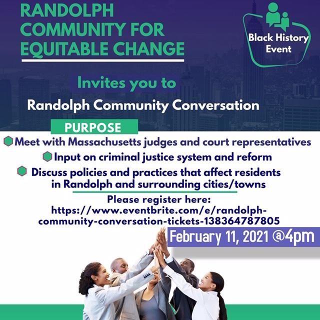 Please join the discussion on Feb. 11 at 4 PM, by registering in advance at the link shown in the flyer. https://www.eventbrite.com/e/randolph-community-conversation-tickets-138364787805