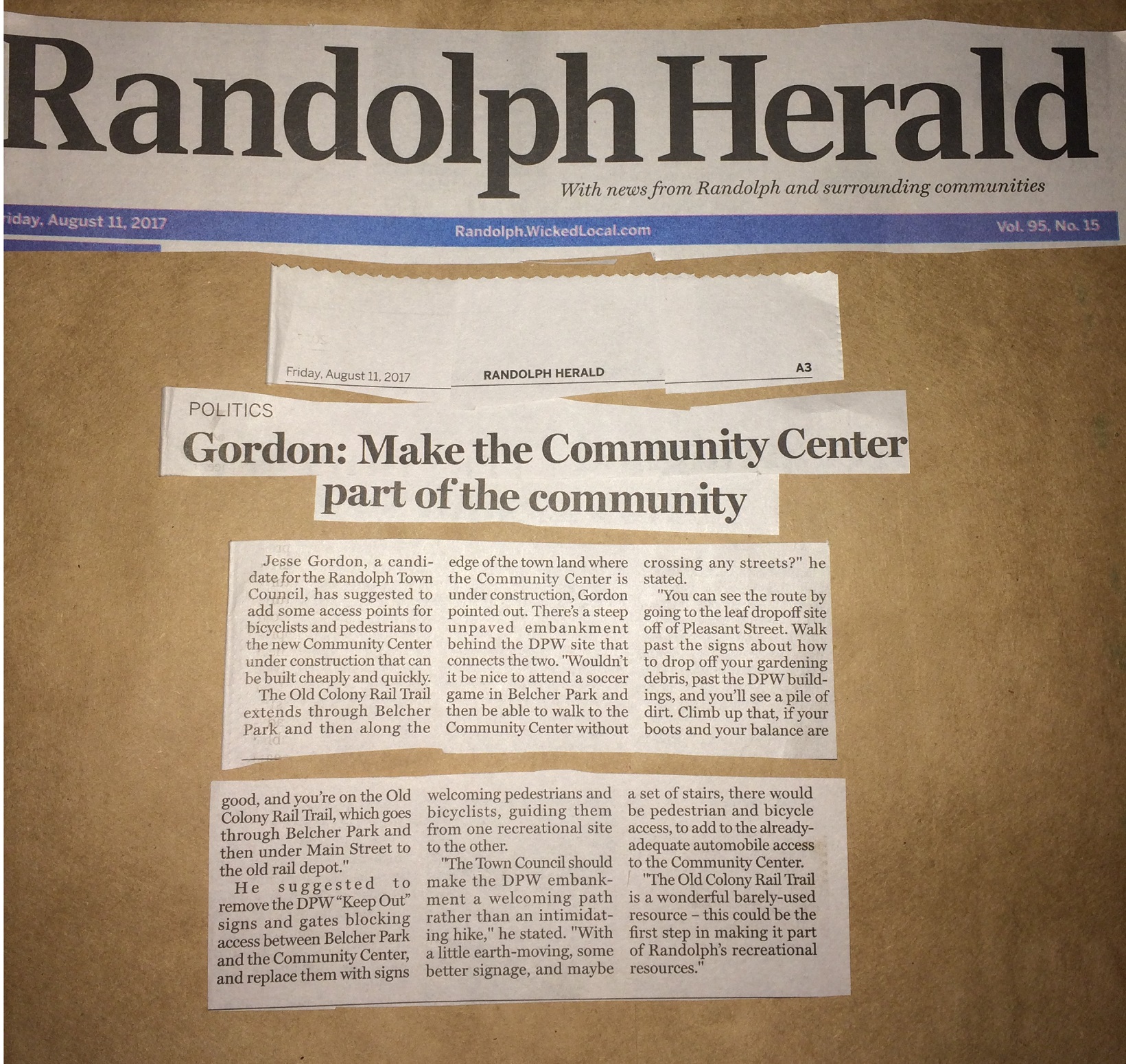 The Old Colony Rail Trail is a wonderful barely-used resource – this could be the first step in making it part of Randolph's recreational resources.