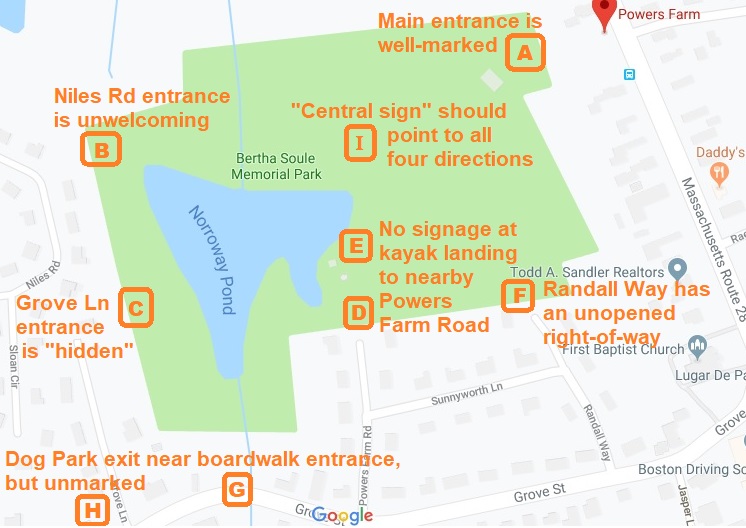 C. Turning south from the Niles Road entrance, there is a path along Norroway Pond towards Soule Park on Grove Lane. That path runs very close to several abutters' backyards and would benefit from signage so that pedestrians would know they are not trespassing on private property. The path splits at Soule Park to exit to Grove Lane, or to continue south to the boardwalk a sign at that point could say "Soule Park / Grove Lane right; Boardwalk straight ahead." At the Grove Lane side of the exit, there is already a sign welcoming visitors to the park. But newcomers would never think to go up Grove Lane to see that sign! (We'll get back to a sign pointing TO the Grove Lane entrance in section H).