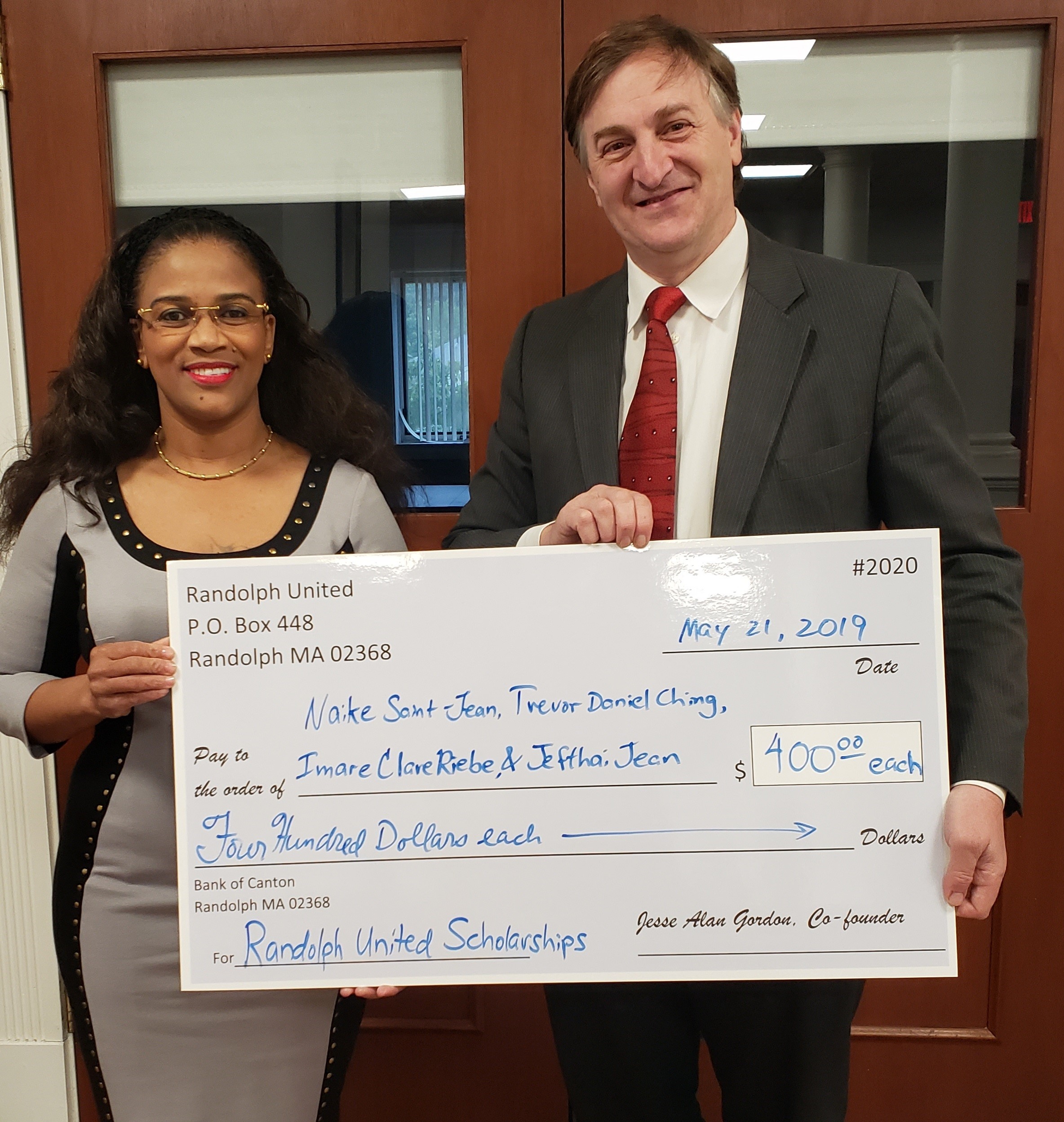 Natacha Clerger, left, and Jesse Gordon, right, are founding members of Randolph United, the organization which awarded the four Randolph High School scholarships. We had so many strong applicants that we picked four instead of just one scholarship recipient, said Jesse Gordon, a co-founder of Randolph United in 2017. We hope to make this the first in a long annual tradition. We awarded $400 for each of the four students, said Judith Harris, the Randolph United treasurer. The students receive their cash award when they finish their first semester at college and show us their report cards. This model follows the same method as the longer-standing tradition of scholarships from the Randolph Democratic Town Committee, of which Harris and Gordon are members. A certificate was presented to each student at an awards ceremony May 21 at Randolph High School. Im very excited about this scholarship and how it brings together the communities of Randolph, which is, in fact, the purpose of Randolph United, said Randolph Town Councilor Natacha Clerger, who is also a member of Randolph United. I hope this becomes the first in a long annual tradition. The scholarship program was inspired by the March For Our Lives rally on March 24, 2018, at Stetson Hall. High school students organized that march and led that march in Randolph and across the country calling for common-sense gun legislation, Gordon said. We saw those students as the future of Randolph, not only on that issue, but applying that participatory spirit to other issues. Randolph United is open to donations, which can be mailed to P.O. Box 448, Randolph, MA 02368.