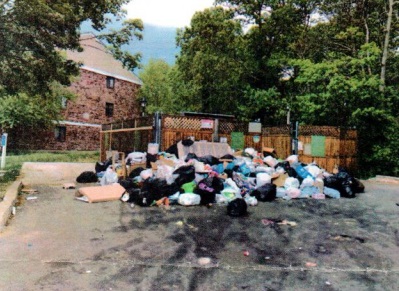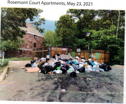 - According to the petition and photos, Rosemont management has failed to store and remove trash in a timely manner (photo to right, and more attached (page 3)).