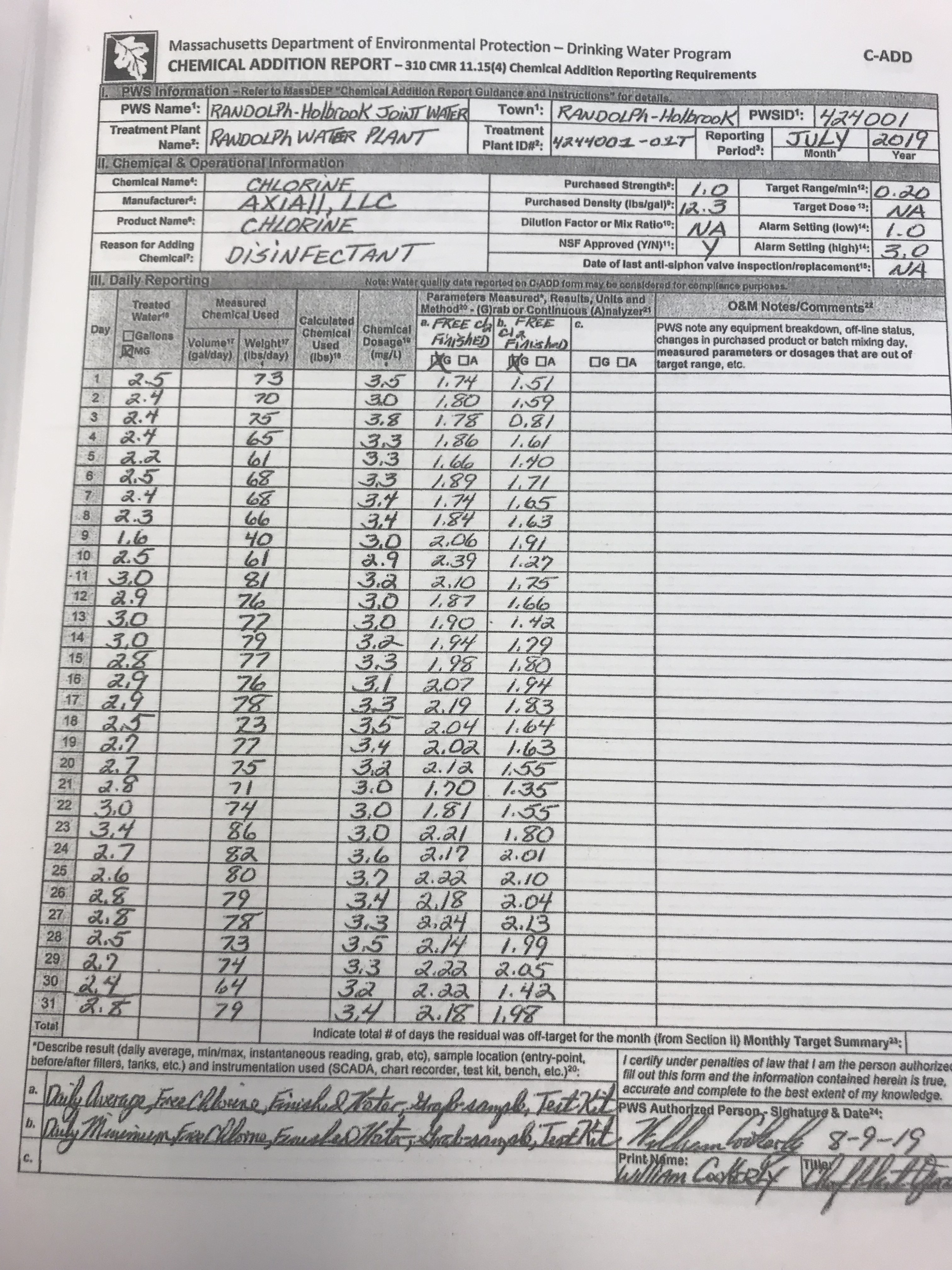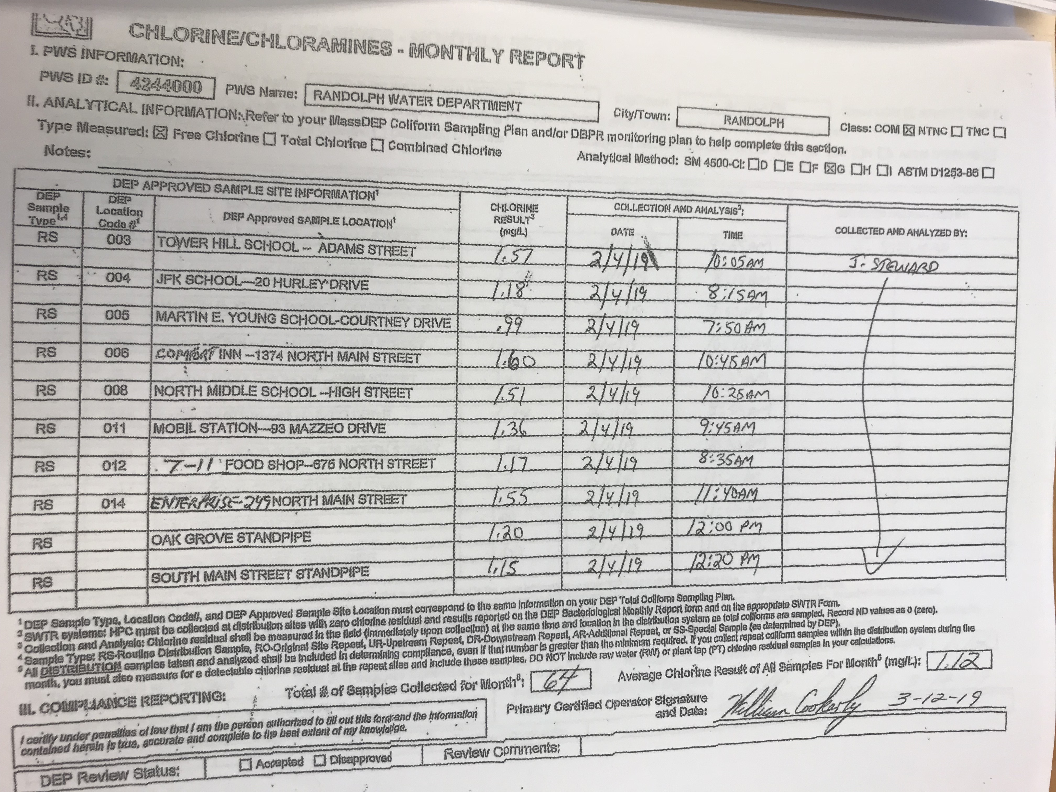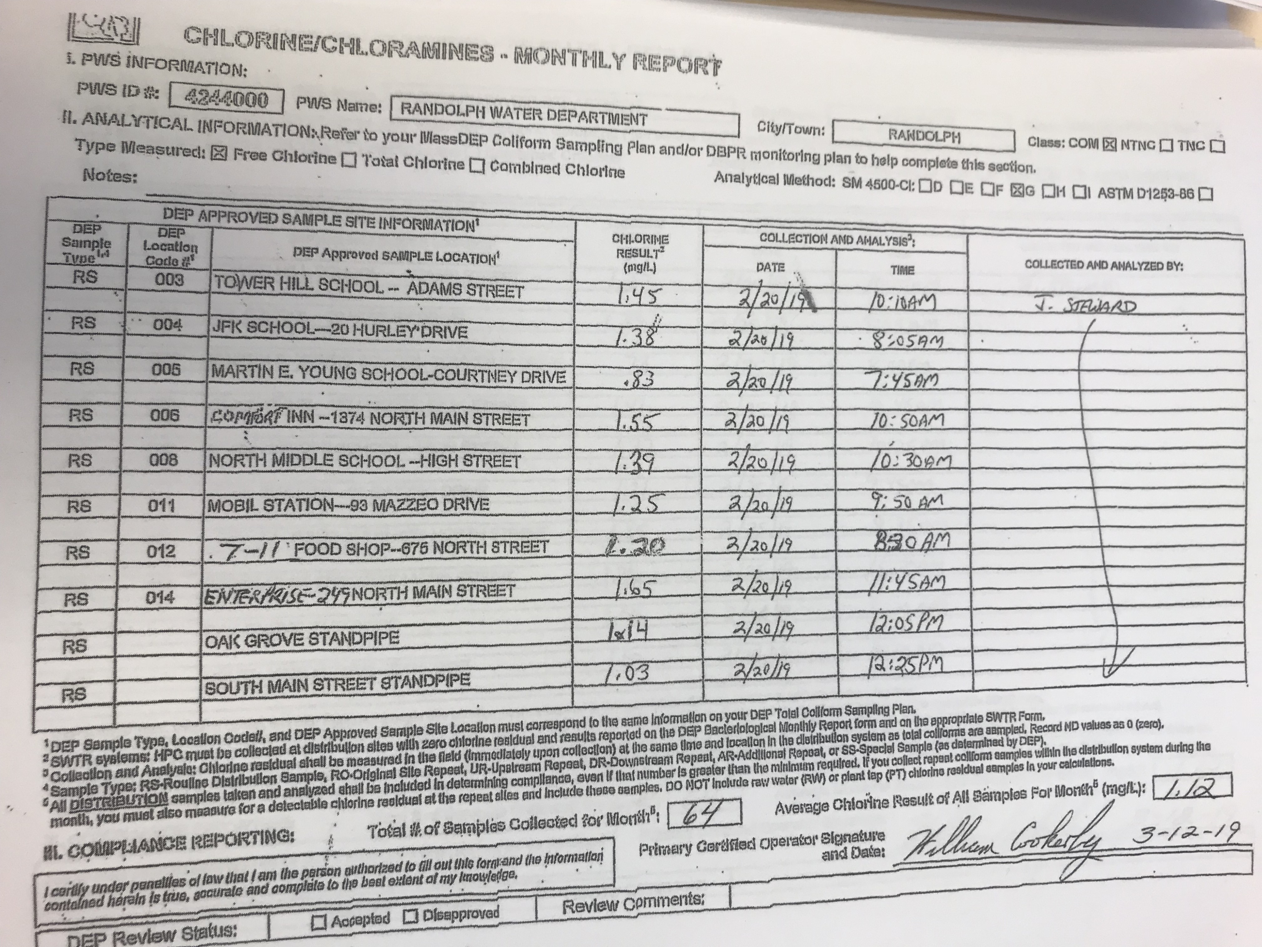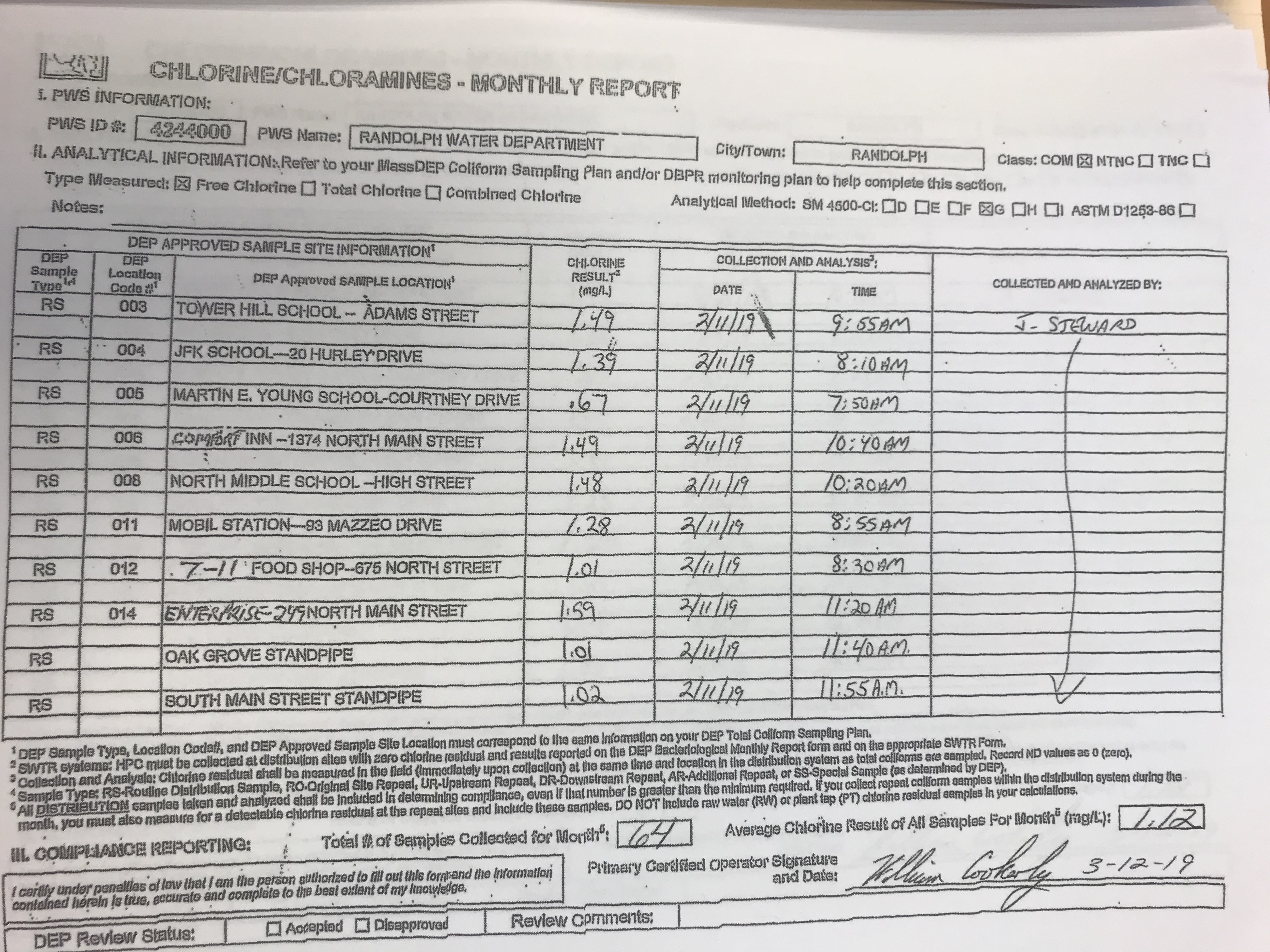 | Document 2119 | Chlorine/Chloramines/FC | 0.99-1.60 mg/L | 2/4/19 | Adams Street; JFK School; Young School; Mazzeo Drive; 6 others 0.99-1.57 mg/L FC measures "free chlorine", which is the residual disinfectant left in the distribution system (chlorine is added at the water treatment plant; the goal is to have just a little left at the tap). Allowed range is "> 0.5 mg/L" TK 2018 report says "max 4ppm for TC" (TC=FC+CC) |