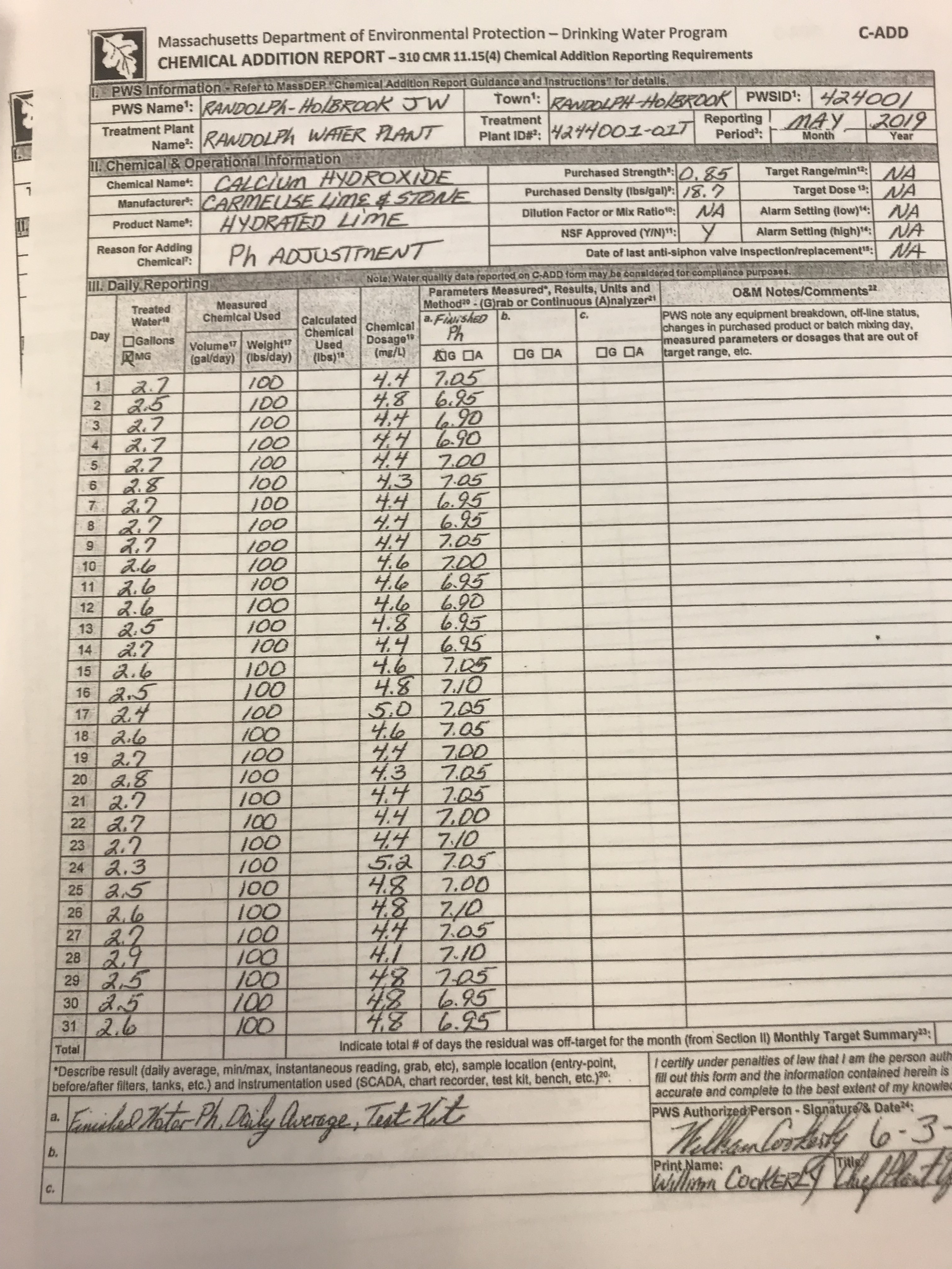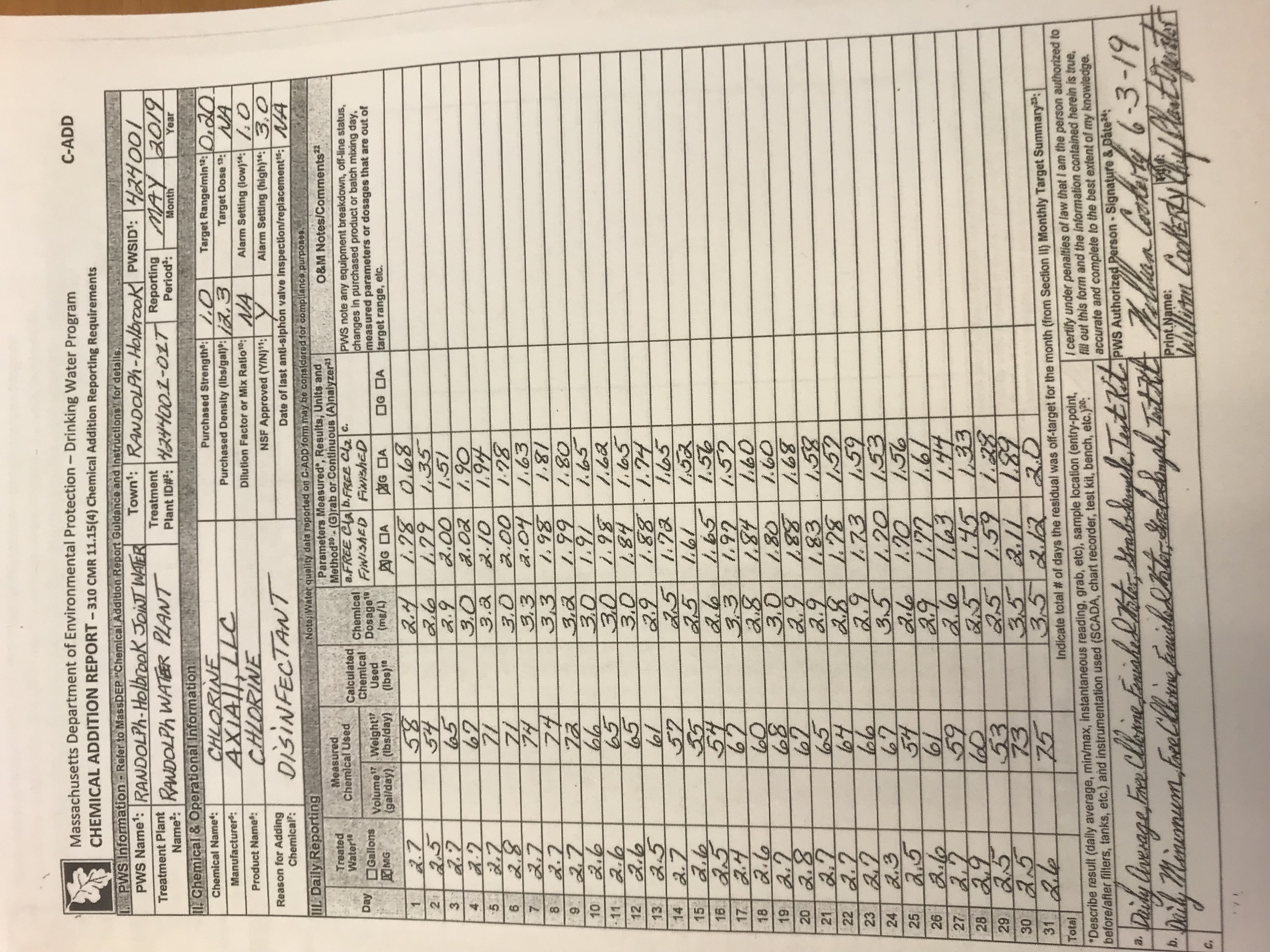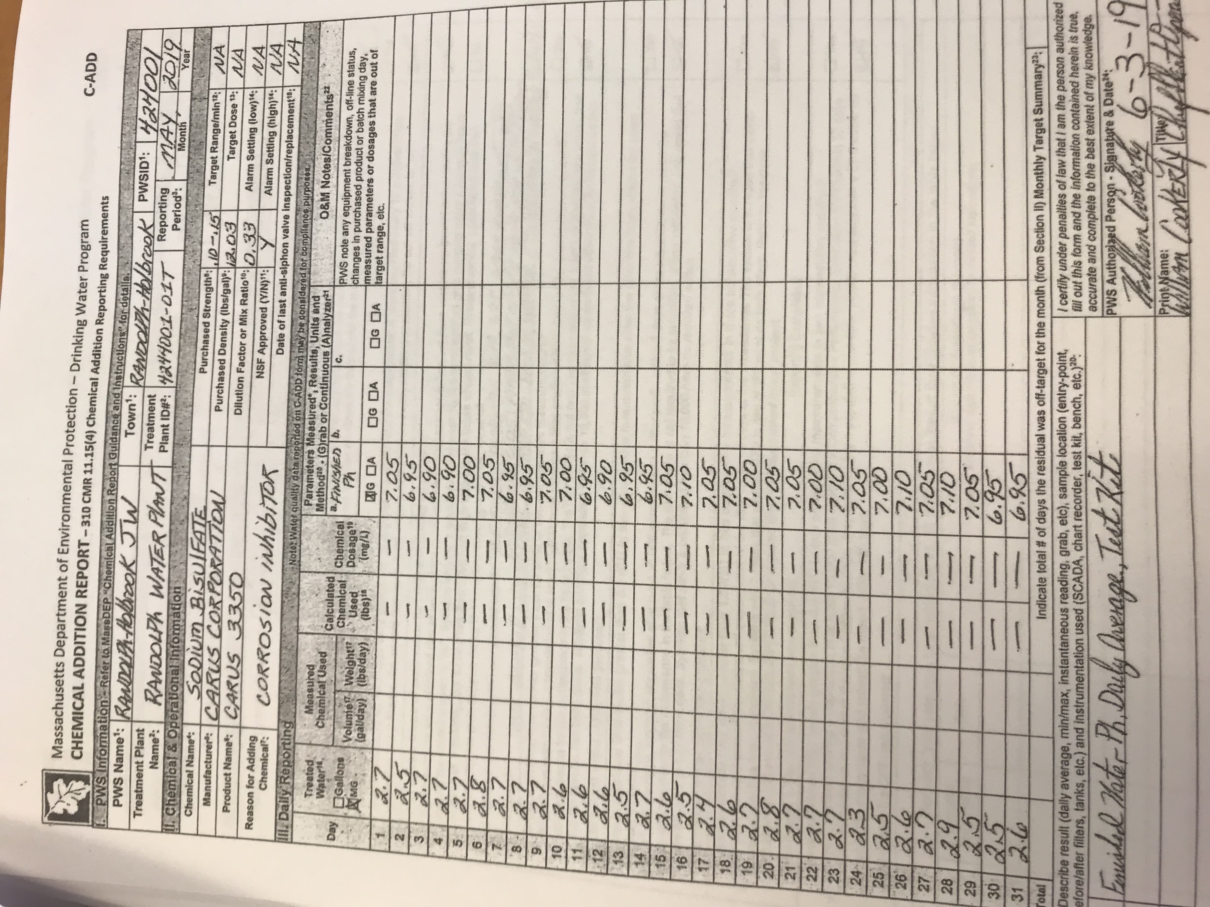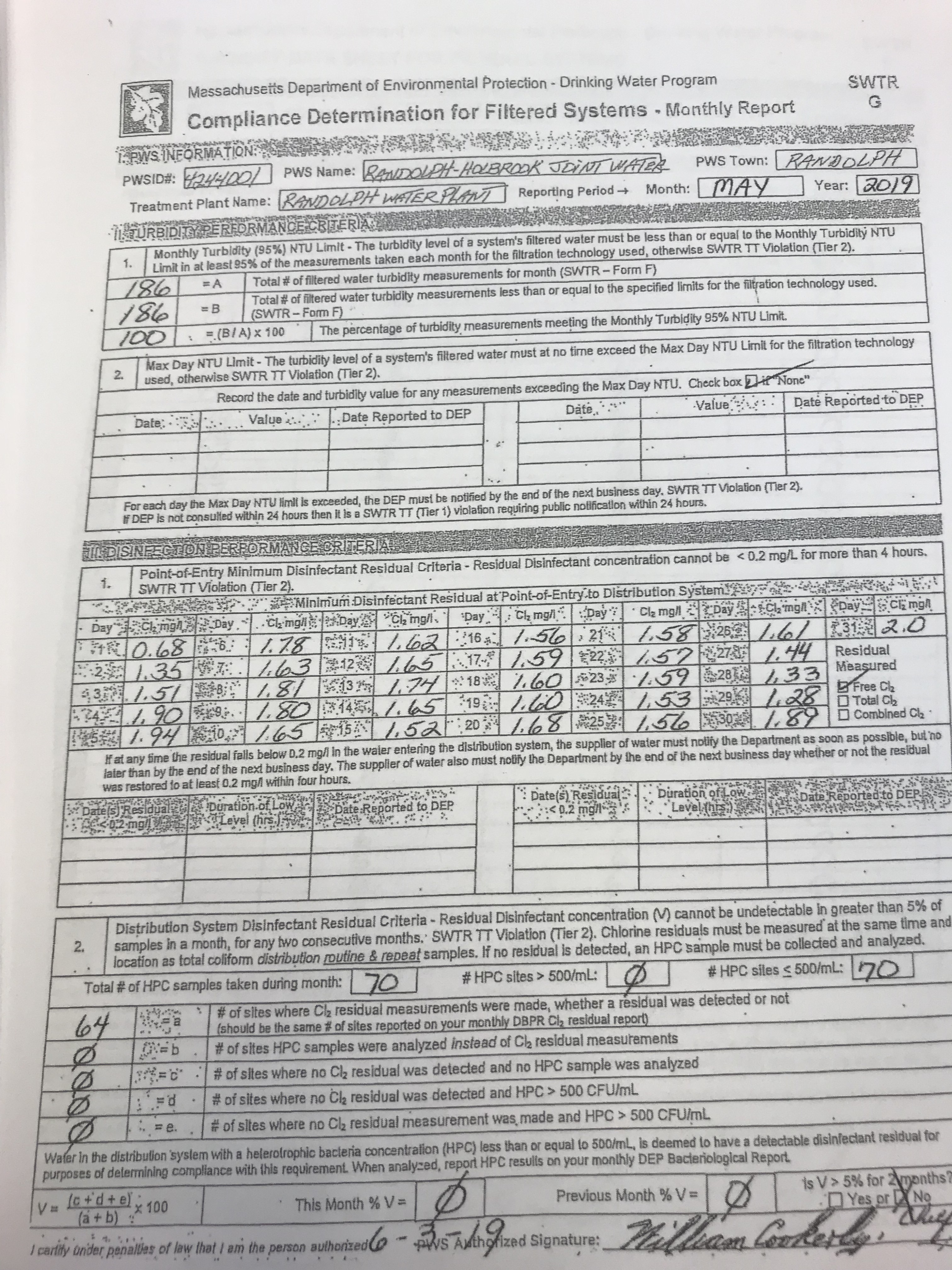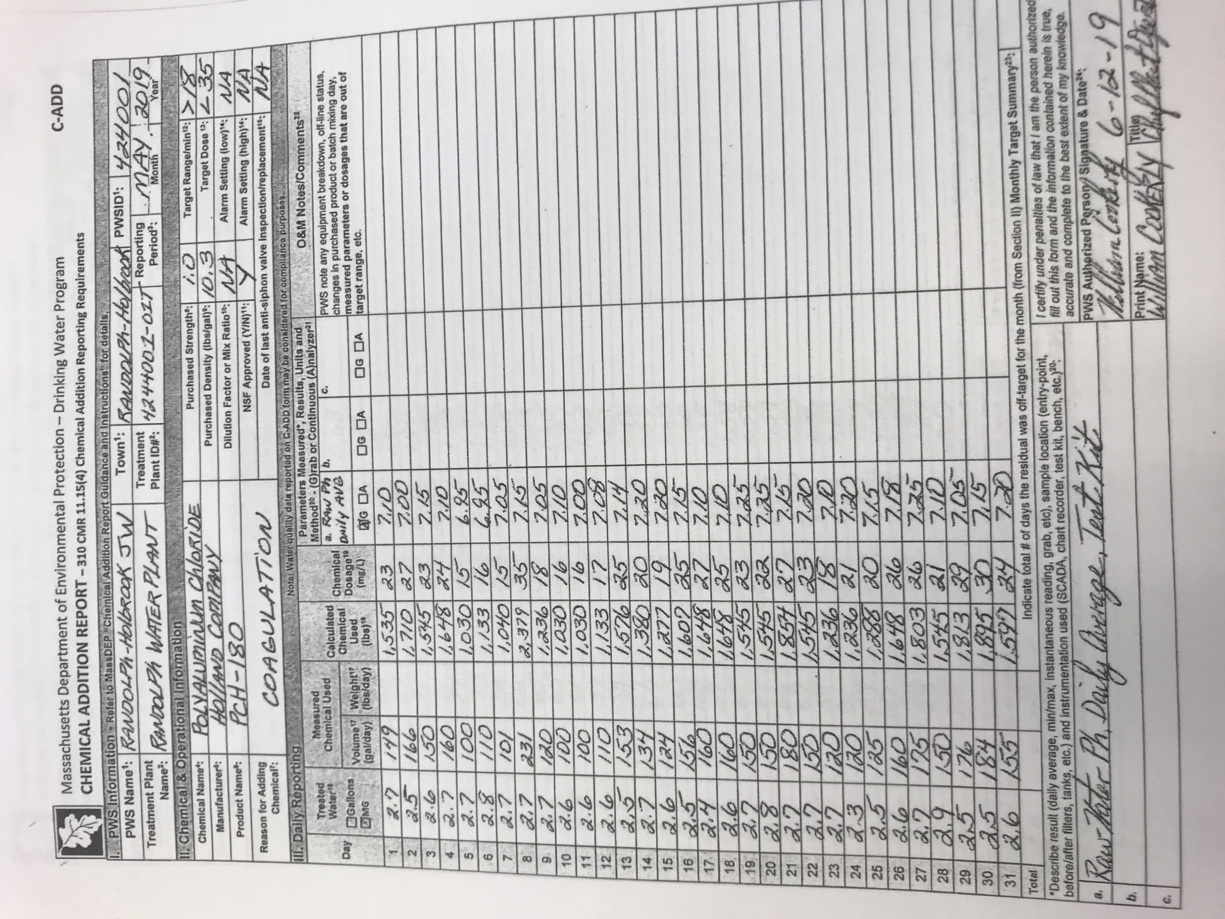 | Document 2123 | May 2019 | Monthly turbidity and chlorine summary at plant; 186 turbidity measurements made; 5 days of Cl2; all passed. |