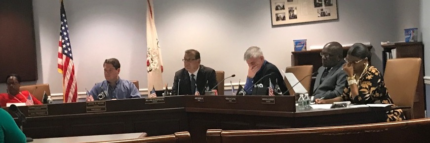 Town Council Hearing on Water Issues: (from left to right):District 3 Town Councilor Katrina Huff-Larmond; Town Council President Jason Adams; At-Large Town Councilor William Alexopoulos; At-Large Town Councilor Jim Burgess; District 1 Town Councilor Ken Clifton; At-Large Town Councilor Natacha Clerger