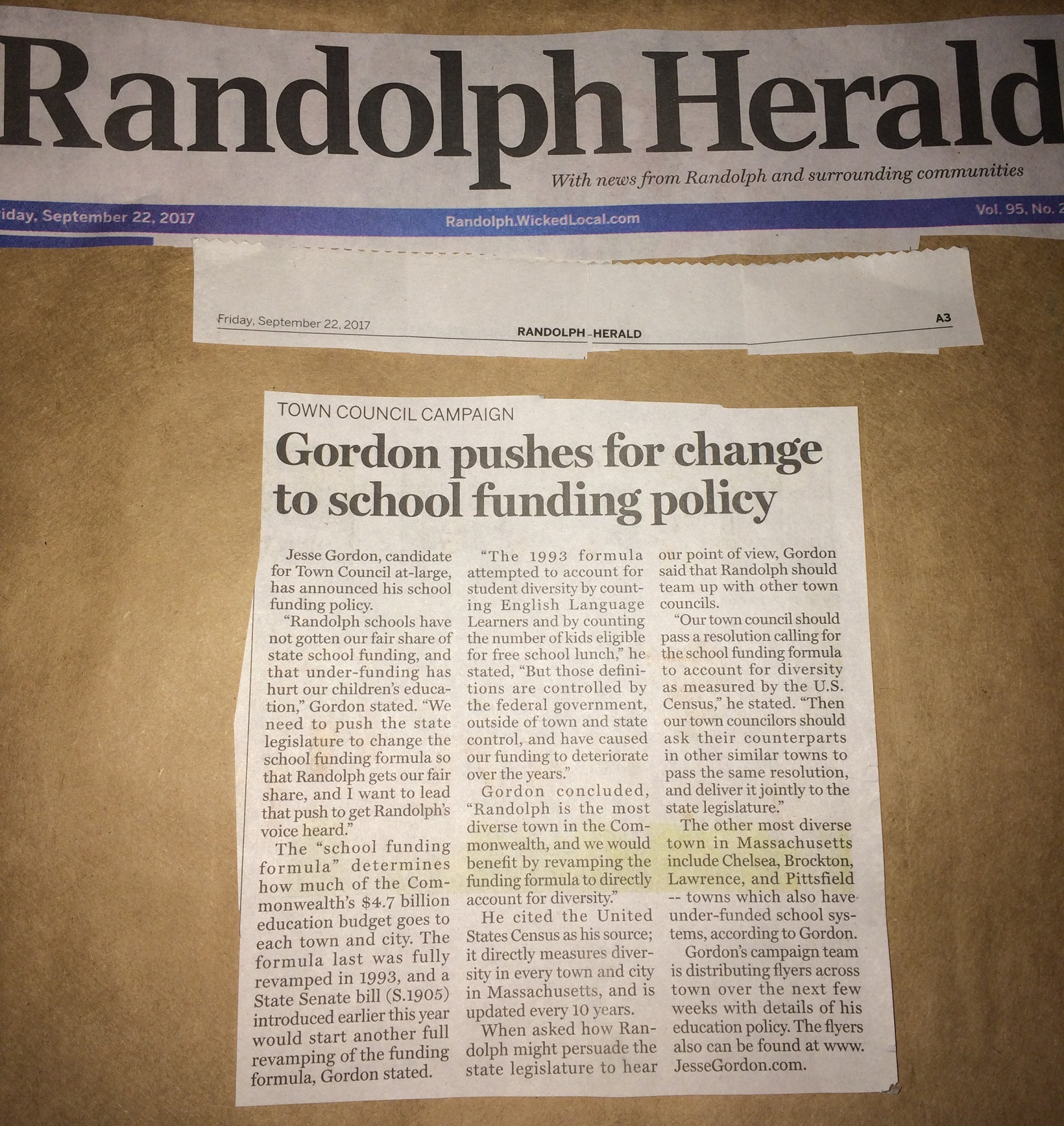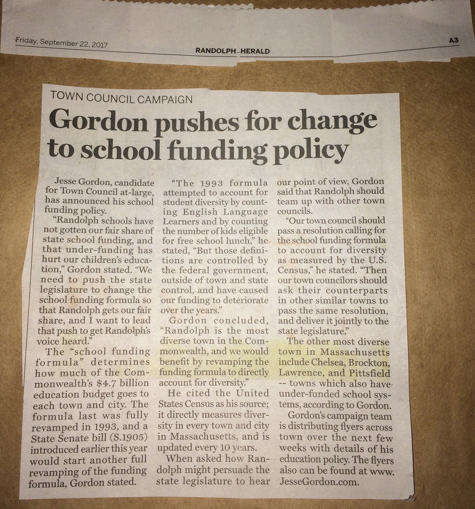 Jesse Gordon, candidate for Town Council at-large, announced his school funding policy this week. "Randolph schools have not gotten our fair share of state school funding, and that under-funding has hurt our children's education," says Jesse. "We need to push the state legislature to change the school funding formula so that Randolph gets our fair share, and I want to lead that push to get Randolph's voice heard."