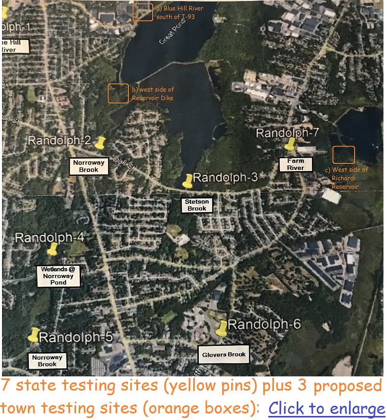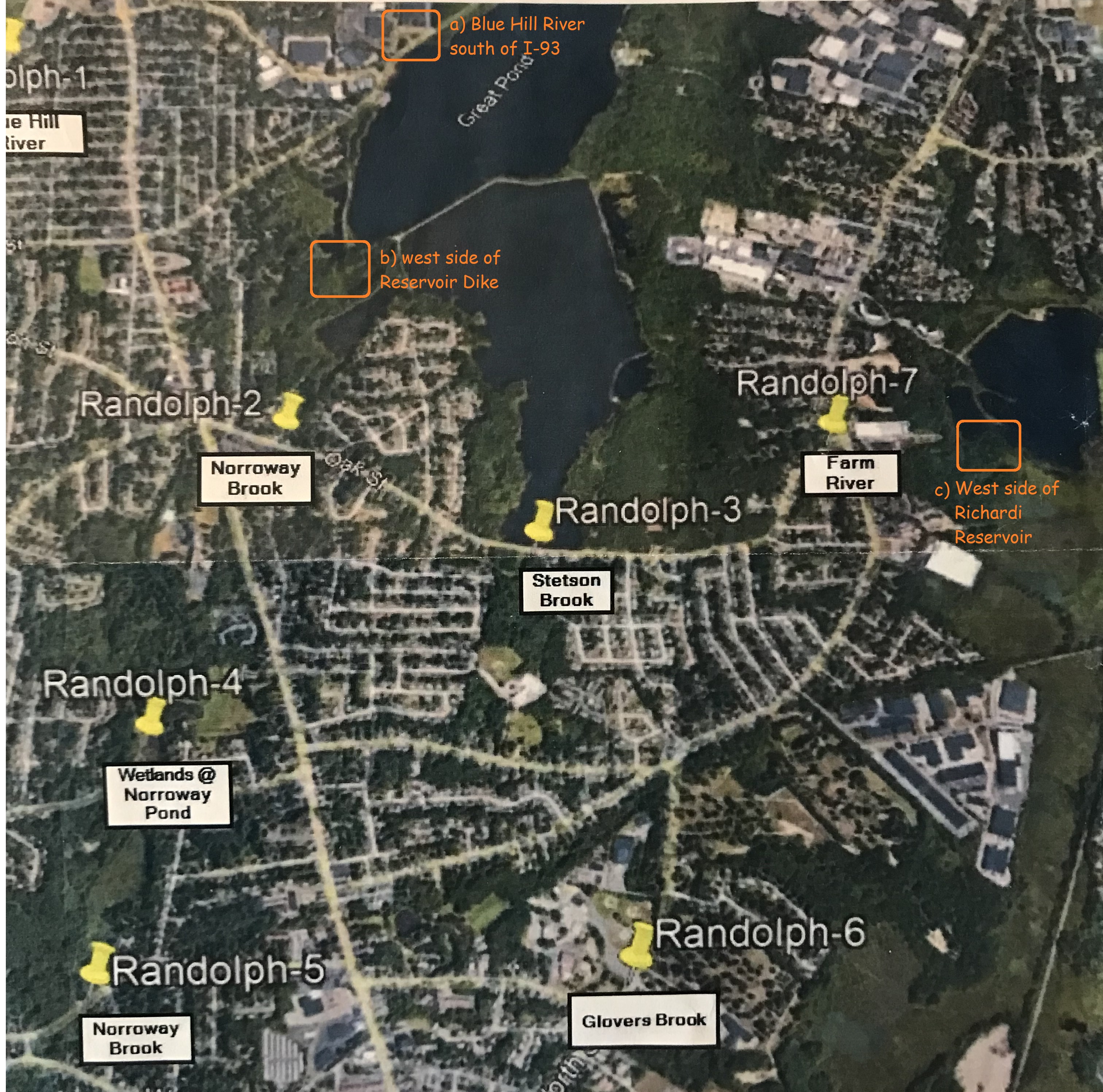 - d) Randolph on west side of Dike: A walkable dike separates the north half from the south half of our reservoir. The neighborhood to the west of that dike includes Pond Street and Webster Street, which have no DEP testing sites, but drain directly into the reservoir through a small stream near the dike. DEP testing includes Norroway Pond south of this neighborhood, and the Blue Hill River north, but not this neighborhood itself.