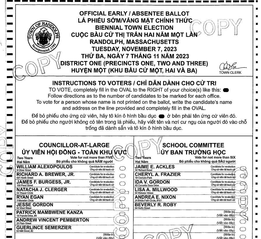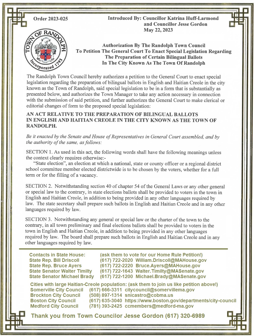 Let's get Randolph's ballot printed in Haitian Creole!Our plan to get bilingual ballots in Haitian CreoleOn the November 2022 ballot, I was thrilled to see our state election ballots printed in Vietnamese as well as the usual English. But I wondered, "Randolph has more Haitian Creole speakers than Vietnamese speakers, so why did the ballots get printed only in Vietnamese?" So we made a plan to fix that! Here's how.... We called the Secretary of State's office (and then several more government agencies!) to figure out the rules. There's a federal law that requires printing the ballot in foreign languages if more than 5% of your city's population speaks one foreign language at home. That 5% is determined by the 2020 census, and took effect across Massachusetts and nationwide in 2022. But the only languages that qualify are Spanish, Asian languages (except Arabic), and Native American languages. That means "yes for Vietnamese but no for Haitian Creole." Could that list of languages be changed? Only by federal legislation ("an Act of Congress"). But we CAN change it at the state/municipal level instead of federally. That's called a "Home Rule Petition," which means an exception to state law for one municipality. That whole process is described here, and the final version of our "Home Rule Petition" appears below -- we'll need YOUR help to make this happen! Some details: Randolph is the only city in Massachusetts that qualified for Vietnamese-language ballots. I asked the Secretary of State's office about neighboring Braintree, which has a Vietnamese Buddhist Temple, but they were under the 5% cutoff. Other municipalities do qualify for Spanish and Chinese and other languages, but only Randolph qualified for Vietnamese-language ballots. Randolph can be proud of serving our Vietnamese-speaking neighbors' election needs well, and now we should work towards serving our Haitian Creole-speaking neighbors too! The federal legislation that specifies that list of languages is Section 203 of the Voting Rights Act, which targets "language minorities [who] have been effectively excluded from participation in the electoral process." Haitian Creole-speakers have not been "effectively excluded," according to our federal government, so there's no requirement to print Haitian Creole ballots even though Randolph has well over 5% of Haitian Creole speakers. Because printing Randolph's ballots in Vietnamese is a federal requirement, the Secretary of State's office pays for translating and printing our ballots. They'll do the same for Haitian Creole, for state and federal elections, but not for municipal elections. That means printing the November 2025 municipal ballots are up to the Town of Randolph to fund, but all the other ballots in 2024 through 2025 are paid for by state funds. The Town of Randolph also has to pay an election worker at each polling place who can assist with the Haitian Creole ballots (i.e. a translator). That same rule applies to our Vietnamese ballots, and Randolph hired Vietnamese-speaking election workers in four polling places in November 2022. Because Randolph has more Haitian Creole speakers than Vietnamese speakers, it will likely be easier to find election workers in that language. Randolph is one of 5 municipalities in Massachusetts with a significant Haitian Creole community. The other 4 are Medford, Somerville, Brockton, and Boston. So we contacted all 4 of those City Councils, to see if they would pass a similar Home Rule Petition. Getting several municipalities to ask for the same Home Rule Petition makes the state legislature much more likely to pass the legislation quickly. If you have friends or family in those other 4 cities, ask them to bring this issue to their City Council! Once the Home Rule petitions get to the legislature, we rely on our State Reps and State Senators to bring the bill to a vote, and to get their colleagues to vote Yes. Contacting your state legislator helps a lot -- just to let them know that you'd like them to pass this legislation it's called "Bill HD.4474". Their contact info is on the legislation. Town Councilors Jesse Gordon and Katrina Huff-Larmond introduced this Home Rule Petition to the Randolph Town Council, and are committed to seeing it through to implementation. Sincerely, Jesse Gordon, (617) 320-6989, jgordon@randolph-ma.gov